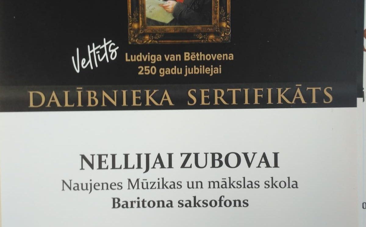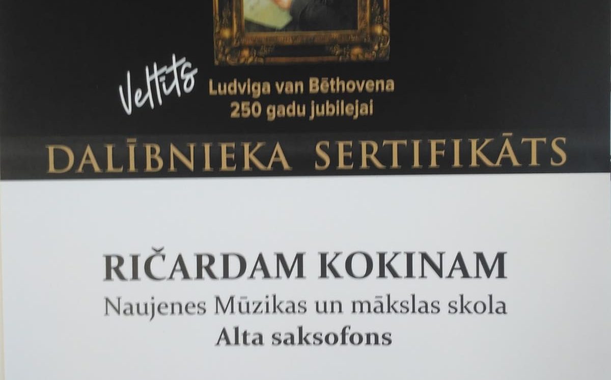 No šī gada no 23. līdz 26. janvārim Jāzepa Vītola Latvijas Mūzikas akadēmijā norisinājās XXV Latvijas Mūzikas skolu pūšaminstrumentu un sitaminstrumentu izpildītāju konkurss. Šogad konkurss bija veltīts izcilā vācu komponista Ludviga van Bēthovena 250 gadu jubilejai. Konkursu rīkoja biedrība “Latvijas Jauniešu pūtēju orķestris”. Tajā piedalījās 186 mūziķi no 51 mūzikas skolas. Naujenes Mūzikas un mākslas skola lepojas ar saviem audzēkņiem, Nelliju Zubovu un Ričardu Kokinu, kuri pēc konkursa rezultātiem ir kļuvuši par III vietu ieguvējiem. Paldies audzēkņu pedagogam Andrejam Ivanovam un koncertmeistaram Gļebam Beļajevam par ieguldīto darbu audzēkņu sagatavošanā konkursam!