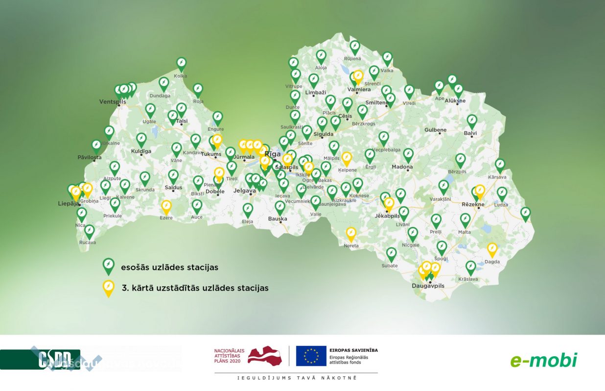 Uzlādes stacijas vienmērīgi izvietotas gan TEN-T ceļu, gan reģionālo ceļu tīklā, kā arī lielākajās apdzīvotās vietās – Rīgā, Daugavpilī, Liepājā, Jelgavā, Ventspilī, u.c., tādējādi nodrošinot gan vietējiem, gan ārvalstu elektromobiļu lietotājiem ērtu un ātru uzlādes pakalpojumu un iespēju ar elektromobiļiem pārvietoties visā Latvijas teritorijā.