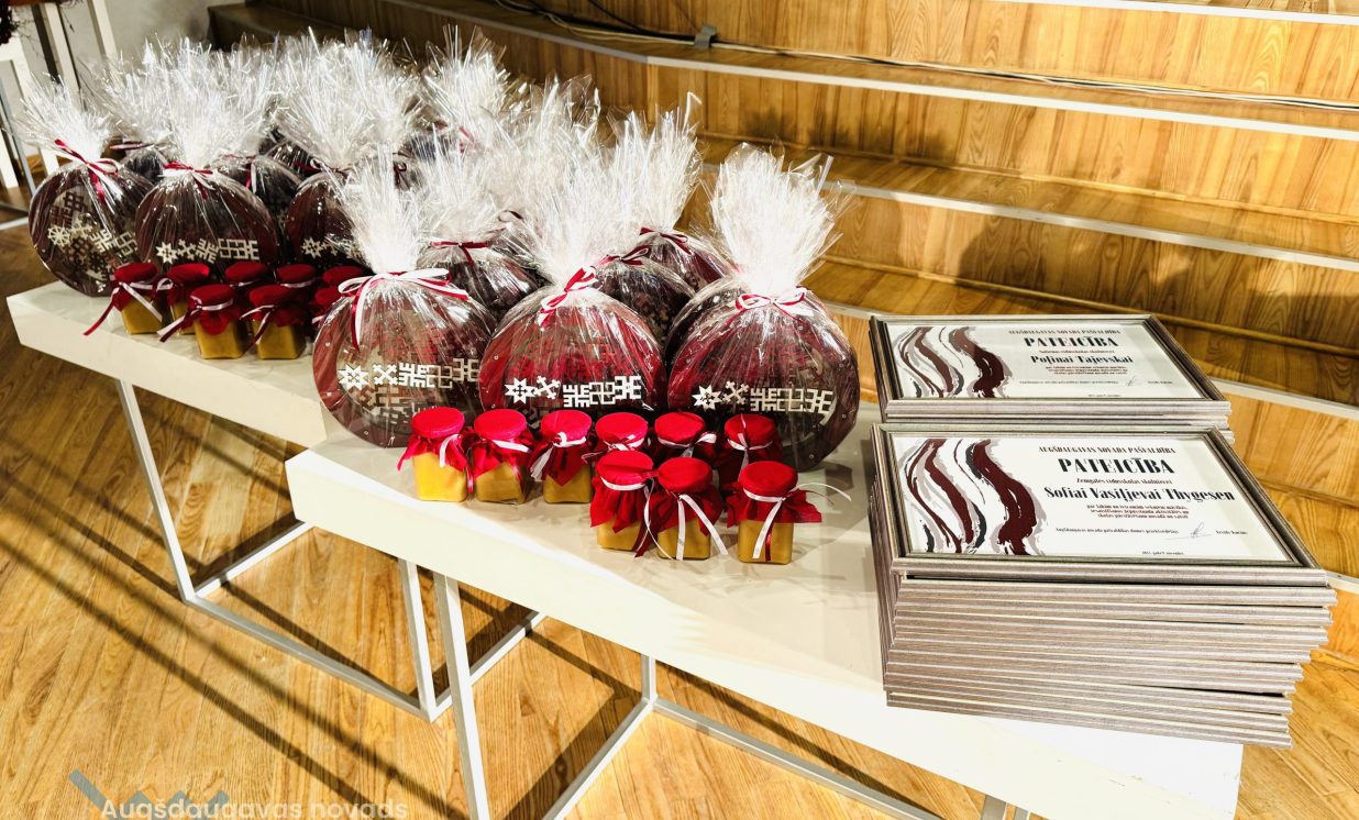 Katrs skolēns saņēma novada Pateicības rakstu un simbolisku dāvanu – krājkasīti ar latviešu rakstu zīmēm. Kāds tajā krās zināšanas un prasmes, cits – sapņus un ieceres, kāds ceļojums un draugus, bet kāds līdzekļus savu vēlmju īstenošanai.