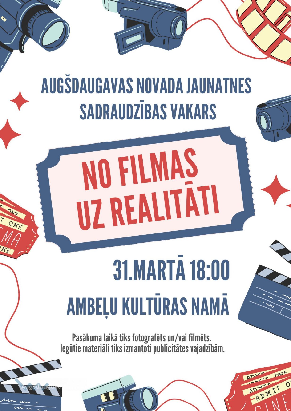 31.martā no plkst. 18.00 līdz 23.00 Ambeļu kultūras namā norisināsies Augšdaugavas novada jauniešu sadraudzības vakars “No filmas uz realitāti”, ko rīko Višķu, Ambeļu, Maļinovas un Dubnas pagastu jaunieši. Pasākumā var piedalīties Augšdaugavas novada pagastu jaunieši vecumā no 13 līdz 25 gadiem kopā ar sava jauniešu centra atbildīgo personu.