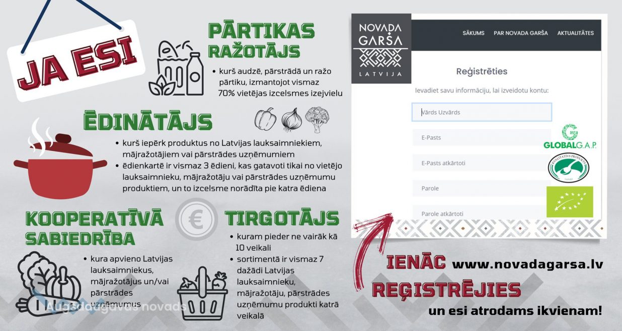 Jebkuram pārtikas ražotājam, kura kaut viena ražotā produkta sastāvā ir vismaz 70% Latvijas izcelsmes izejvielu, var reģistrēties katalogā "Novada Garša".