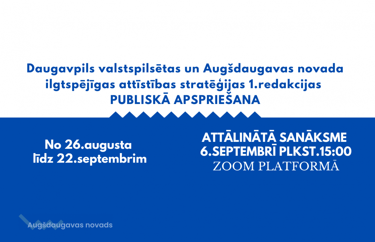 Saskaņā ar Daugavpils pilsētas domes lēmumu un Augšdaugavas novada domes lēmumu, uzsākta Daugavpils valstspilsētas un Augšdaugavas novada ilgtspējīgas attīstības stratēģijas līdz 2030.gadam 1.redakcijas publiskā apspriešana.