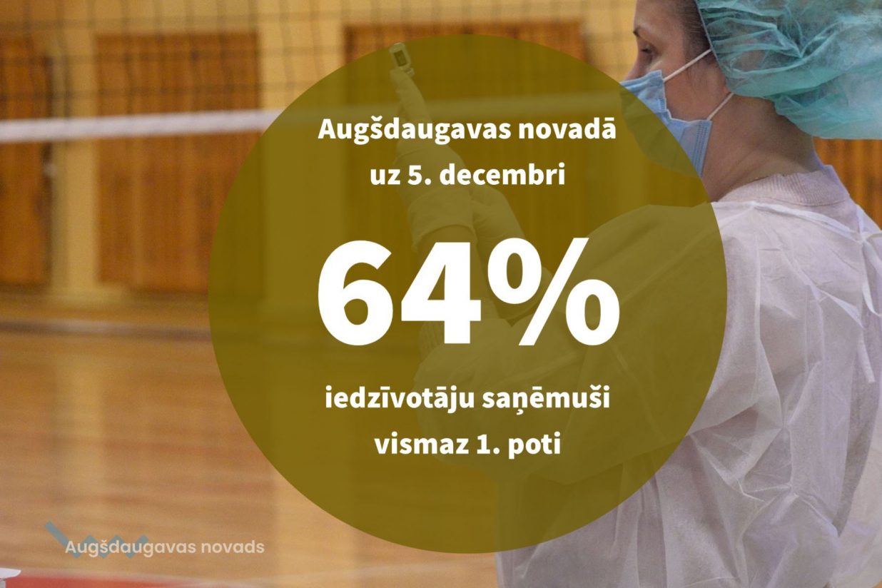 Kā liecina statistikas dati, uz 5. decembri mūsu novadā pirmo poti pret Covid – 19 saņēma 64% iedzīvotāju. No kopumā gandrīz 26 tūkstošiem iedzīvotāju, sākot no 12 gadu vecuma, pirmo devu saņēma 16 470 cilvēki.