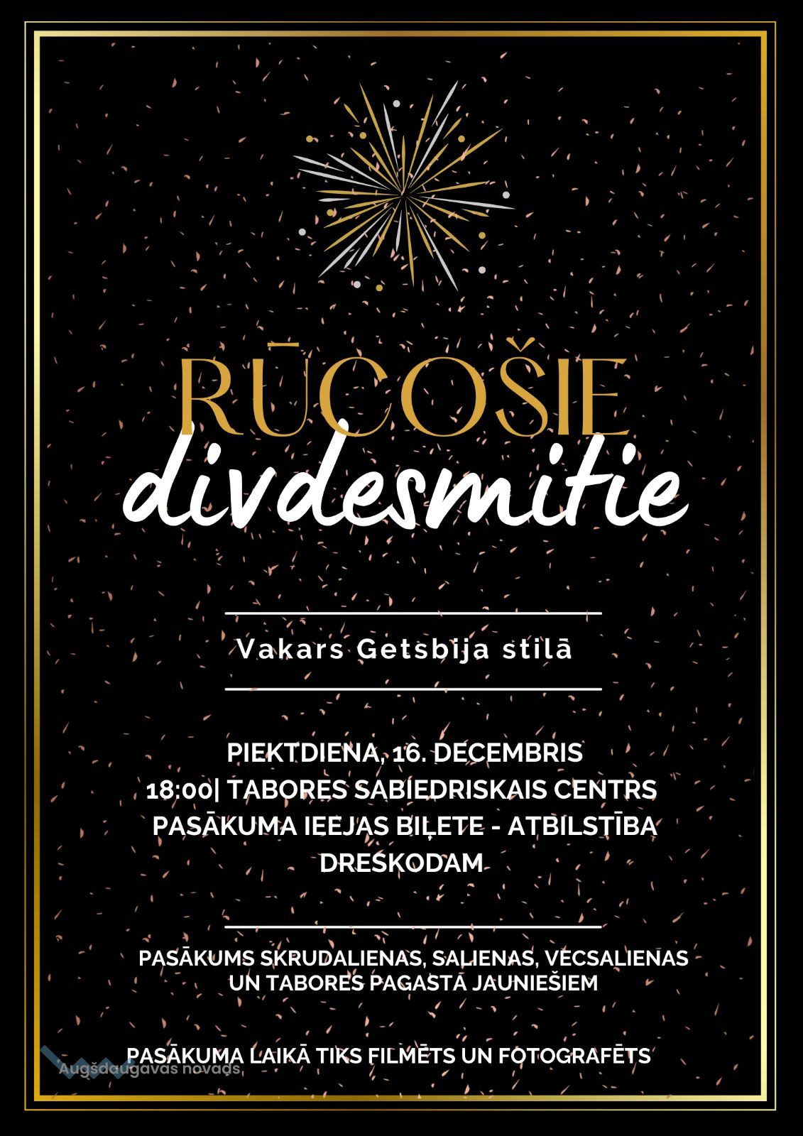 Balle jauniešiem Getsbija stilā13.12.2022AKTUĀLI 16. decembrī Tabores pagasta Sabiedriskā centrā Salienas, Tabores un Skrudalienas pagastu jauniešiem notiks Ziemassvētku balle Getsbija stilā. Katram dalībniekam būs iespēja iekļūt 20.gadu Čikāgas atmosfērā. Ieejas biļete- ATBILSTOŠAIS DRESKODS.