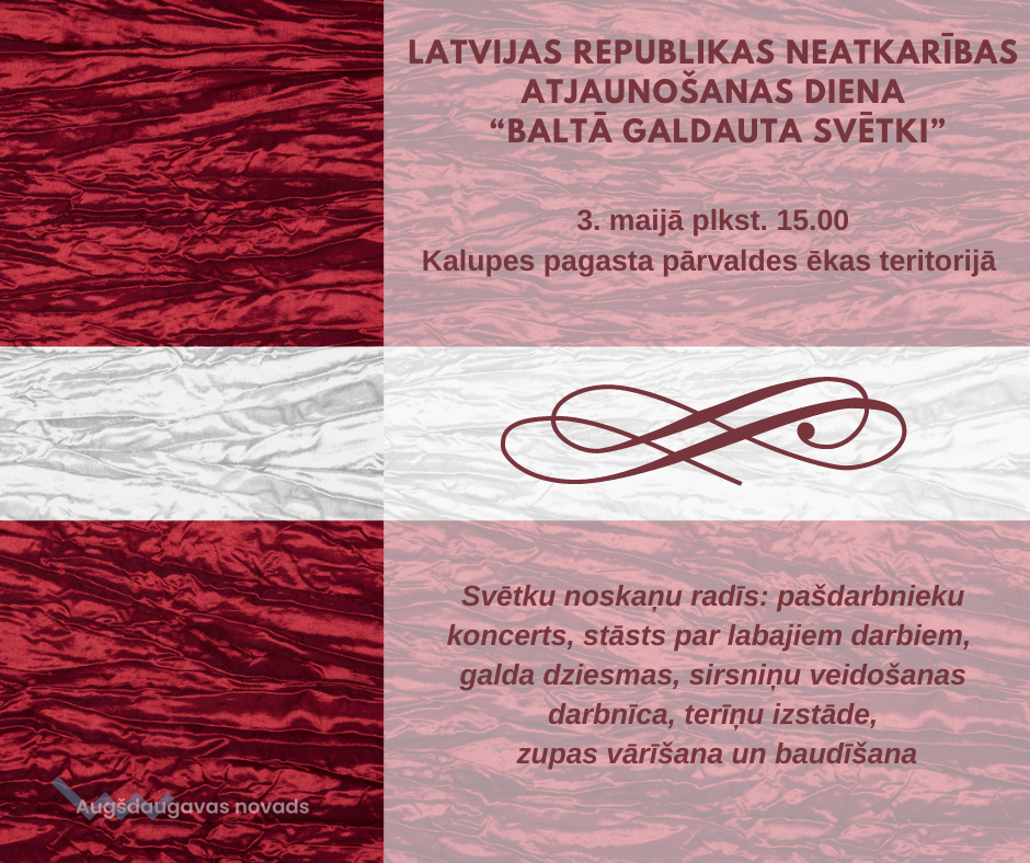 3. maijā plkst. 15. 00 aicinām Kalupes iedzīvotājus piedalīties Latvijas Republikas Neatkarības atjaunošanas dienas -,,Baltā galdauta svētkos”.