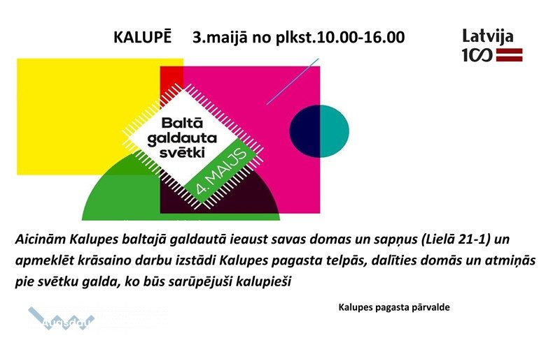 3. maijā no plkst. 10.00 - 16.00 Kalupes pagasta pārvaldes ēkā: