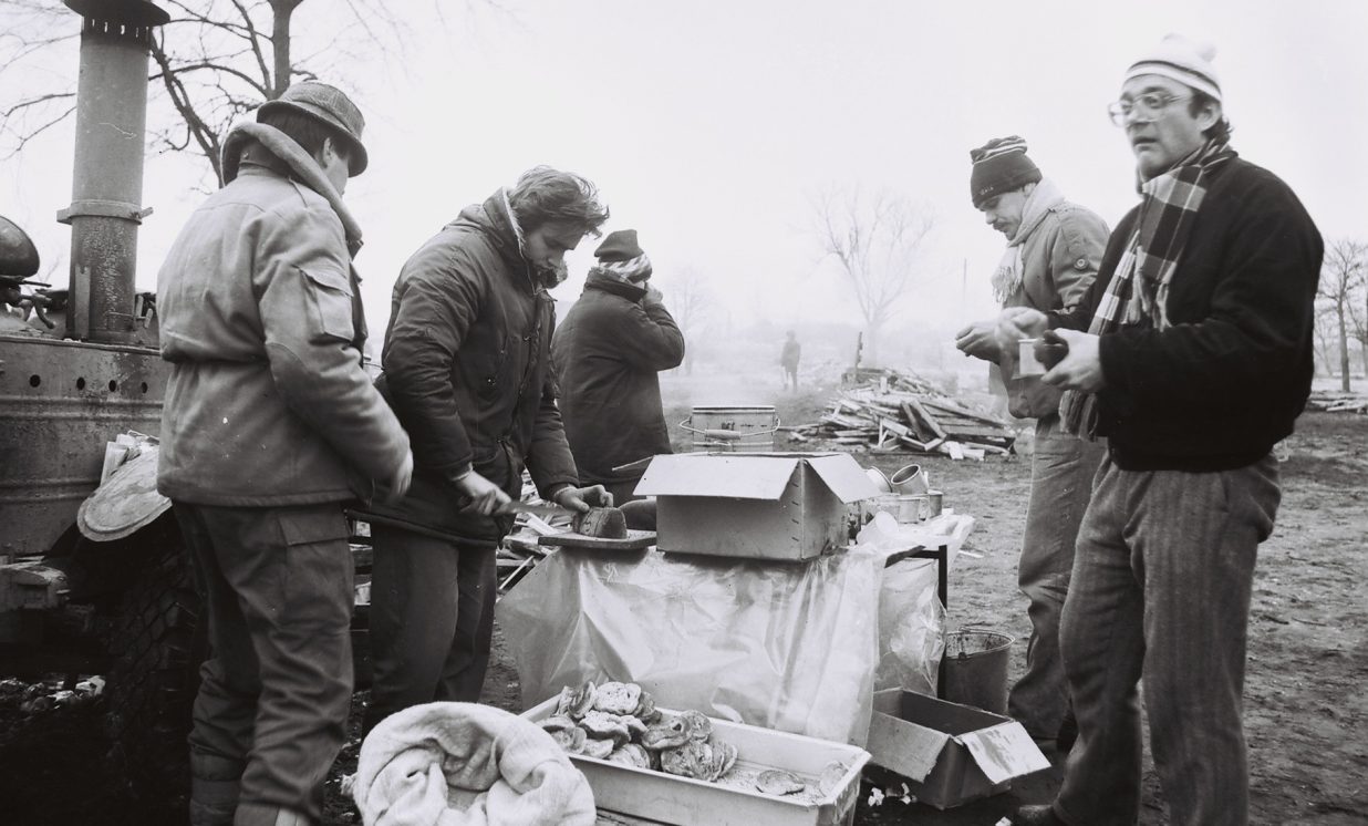 Cilvēki apkārt bija ārkārtīgi draudzīgi savā starpā, un kopēja atmosfēra, kas valdīja Rīgā bija laba. Viens otram izpalīdzēja, kā varēja. Laikapstākļi nebija īpaši bargi, varbūt neliels sals, naktī kurināja ugunskurus, turpina kalupietis.