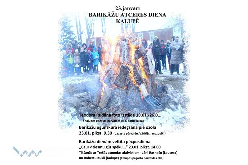 23.01. plkst. 14.00 Barikāžu dienām veltīta pēcpusdiena ,,Caur dziesmu gūt spēku...” . Tikšanās ar Trešās atmodas aktīvistiem - Jāni Rasnaču (Laucesa) un Robertu Kukli (Kalupe). Kalupes pagasta pārvaldes ēkā.