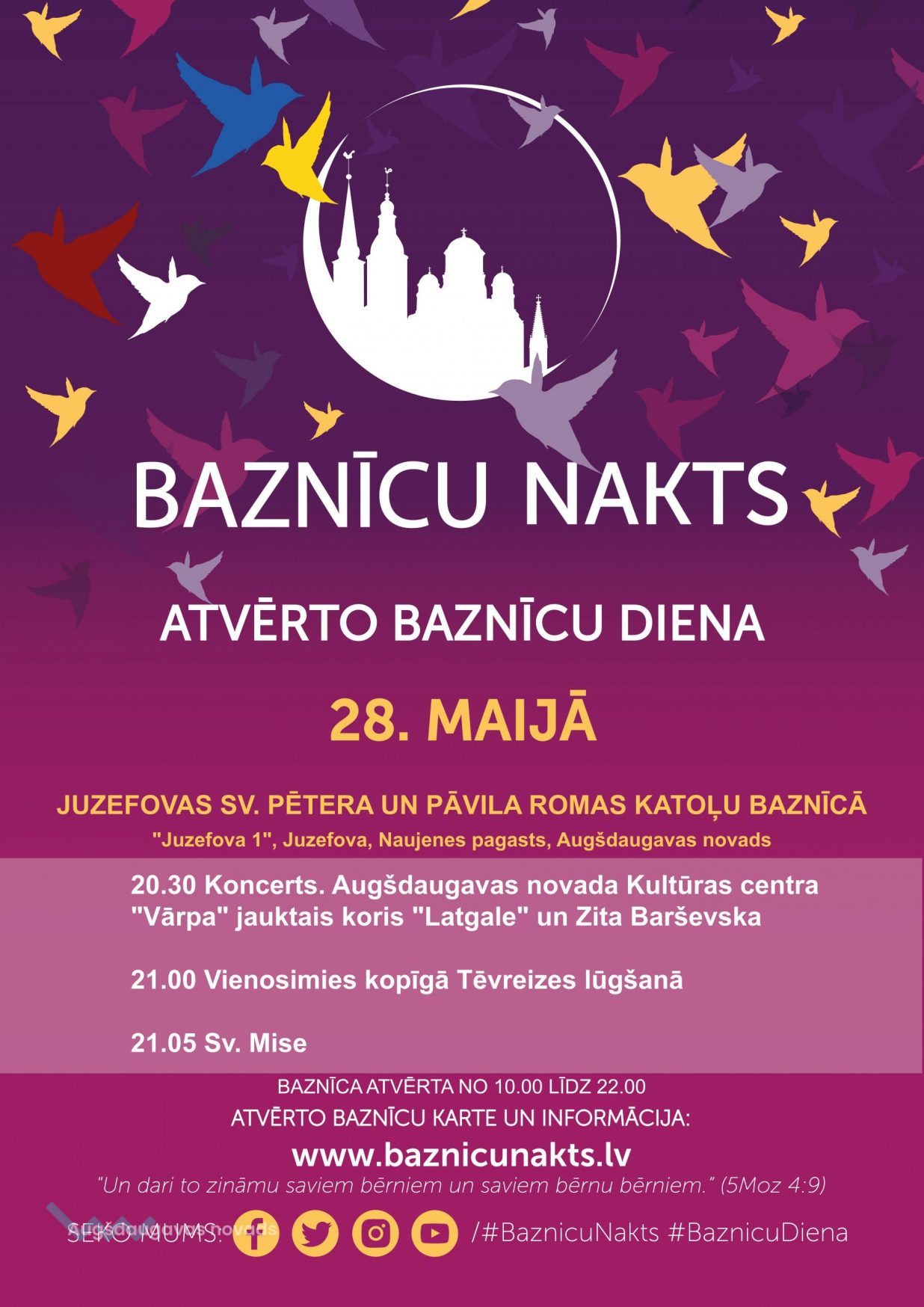 Juzefovas Sv. Pētera un Pāvila Romas katoļu baznīca ("Juzefova 1", Juzefova, Naujenes pagasts, Augšdaugavas novads) 28. maijā apmeklētājiem būs atvērta no plkst. 10.00 līdz plkst. 22.00.