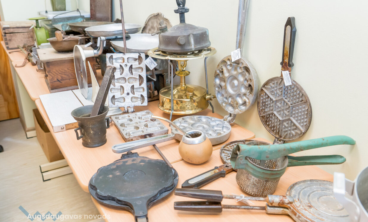 Ērikas kolekcijā atrodas arī galda piederumi, kas nāk no dažādiem laikiem, sevišķi daudz ir piederumi no padomju laikiem: “Ir galda piederumi ar miera baložiem, pat ar sirpi un āmuru, ar PSRS simbolu. Rodas jautājums, vai tiešām mēs kādreiz bijām tik lieli padomju savienības patrioti, ka ģerbonis bija jāliek pat uz galda piederumiem? Man šķiet, tas viss bija stipri pārspīlēts,” teic Ērika. Kolekcionāre stāsta, ka īpaši aizraujoši ir pētīt šos galda piederumus ar palielināmo stiklu, jo tad var labāk apskatīt visus ornamentus un zīmējumus, var atrast dažādas interesantas lietas. Kolekcijā var apskatīt arī dažādas virtuves iekārtas un priekšmetus, ko kādreiz cilvēki izmantoja ikdienā: cepumu pannas, kombainus, kas paredzēti meža ogu lasīšanai, maizes kastes, vāzes, krūkas, pat padomju laika svarus, kas kādreiz daudz izmantoti Bebrenes tehnikuma virtuvē. Ērikas kabinetā var atrast arī kādu oriģinālo kafijas bundžu “Vasara”, kas saglabājusies neskarta ar visu kafiju iekšā, ir arī dažādi iepakojumi, piemēram, buljona kubiciņu kastīte: “Agrāk ražoja buljona kubiciņus, ko lika metāla kastītē un tālāk pārdeva. Es gan ko tādu no bērnības neatceros, bet izrādās, bija!”