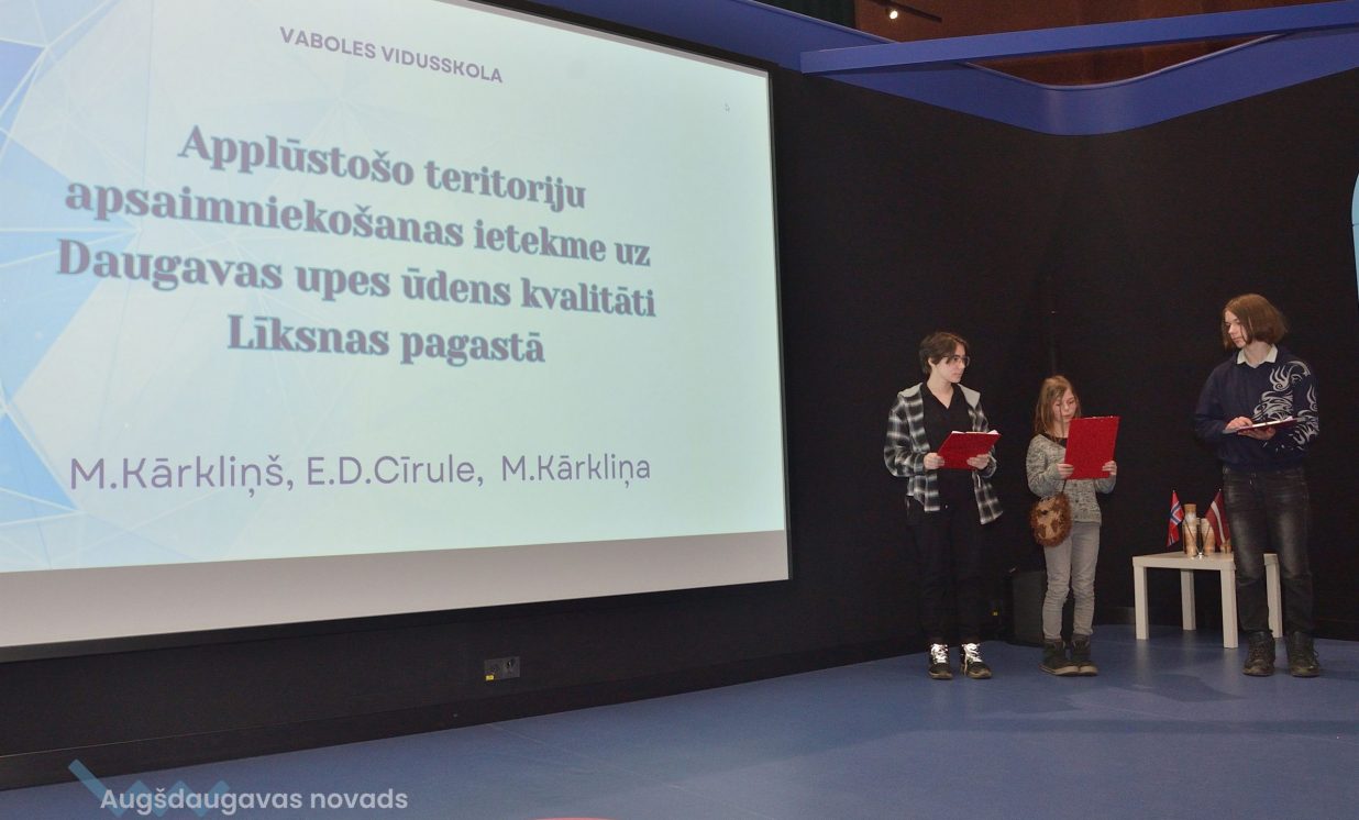 Trīs jauniešu (Miķelis, Māra un Elīza) komanda no Vaboles vidusskolas pētīja lauksaimniecības zemes piesārņošanas problēmu un ūdens kvalitāti: “Mēs bijām aizbraukuši uz trīs dažādām pļavām, kur ņēmām zemes paraugus. Tas bija Līksnas pagastā pie Daugavas krasta.” Jaunieši vēlējās noskaidrot fosfātu un nitrātu līmeni dažādos attālumos no ūdens.