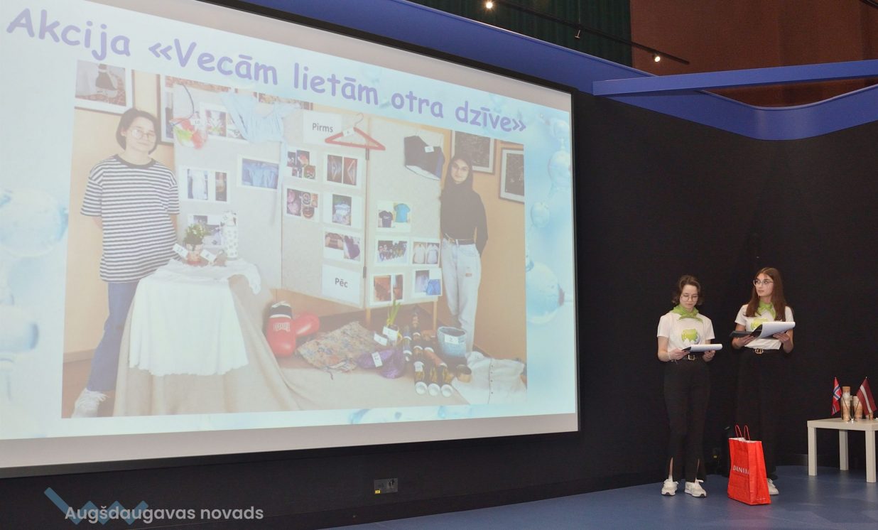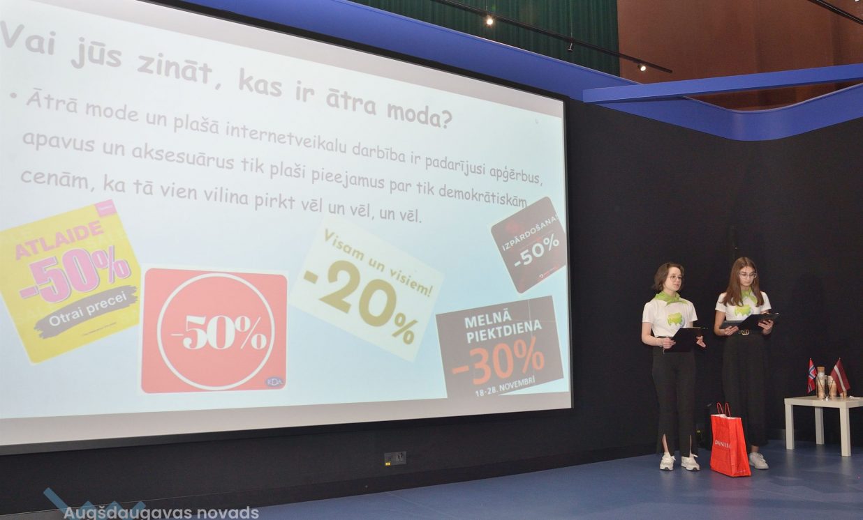 Jaunietes no Sventes vidusskolas pievērsās apģērbu valkāšanas un pārstrādes paradumu problēmai. Izrādās, lai saražotu vienu T-kreklu ir nepieciešami 2700 l ūdens, turklāt daudzi cilvēki nepārstrādā apģērbu, neatdod to nabadzīgiem, un neaizdomājas par ietekmi uz klimatu. “Organizējām akciju savā skolā, kuras mērķis bija veicināt lietotu apģērbu pārstrādi,” teic Anna un Olga.