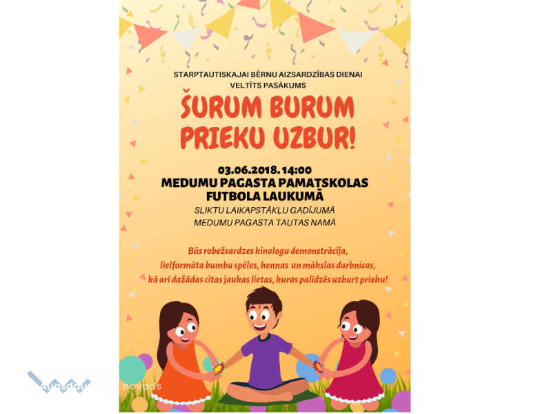 Aicinām visus Medumu pagasta bērnus, pēc iespējas ar saviem vecākiem vai vecvecākiem, š.g. 3. jūnijā sanākt kopā plkst. 14:00 uz Medumu pagasta pamatskolas futbola laukuma, kur notiks pasākums veltīts Starptautiskajai bērnu aizsardzības dienai "Šurum burum - prieku uzbur!", kur kā bērni, tā arī viņu vecāki varēs piedalīties dažādās aktivitātēs, kuras padarīs šo dienu jo īpaši interesantu un prieka piepildītu!