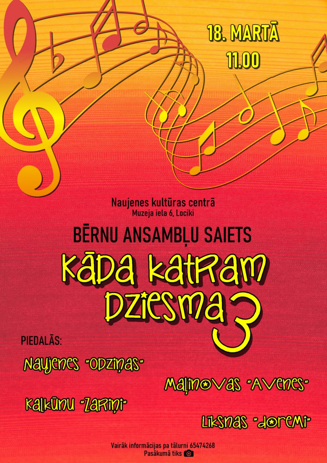 18. martā plkst. 11.00 Naujenes kultūras centrā notiks bērnu ansambļu saiets “Kāda katram dziesma 3”. Ar dziesmām mūs priecēs Augšdaugavas novada bērnu ansambļi – Naujenes “Odziņas”, Kalkūnu “Zariņi”, Maļinovas “Avenes” un Līksnas “DoReMi” gan jaunākā, gan vecākā grupiņa. Mazie mākslinieki ar nepacietību gaida, kad dosies uz skatuves rādīt savus talantus un, protams, gaida ciemos visus savus radus, draugus un ciemiņus.