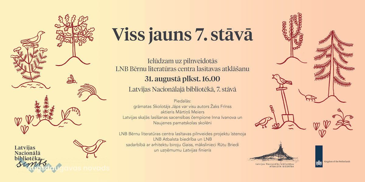 31. augustā plkst. 16.00 Latvijas Nacionālās bibliotēkas (LNB) Atbalsta biedrība aicina uz LNB Bērnu literatūras centra pilnveidotās lasītavas atklāšanu “Viss jauns 7. stāvā”. Pilnveidotā lasītava ir Biedrības dāvana LNB 100. dzimšanas dienā. Tās atklāšana notiks bibliotēkas simtgades svinību ietvaros.