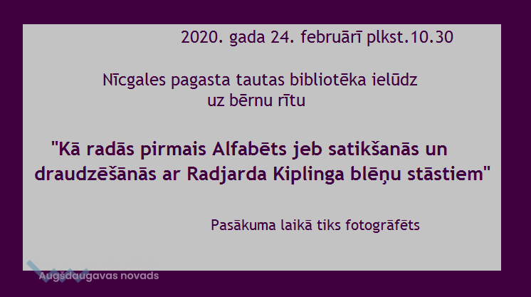 Bērnu rīts Nīcgales pagasta tautas bibliotēkā21.02.2020Kultūra 24. februārī Nīcgales pagasta tautas bibliotēkā notiks bērnu rīts "Kā radās pirmais Alfabēts jeb satikšanās un draudzēšanās ar Radjarda Kiplinga blēņu stāstiem”.