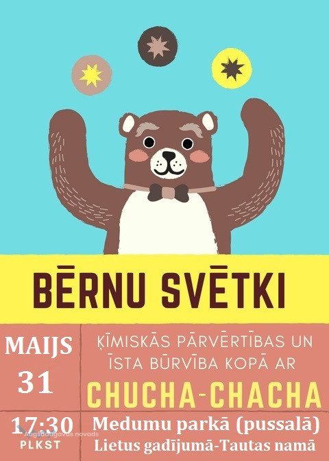 Bērnu svētki Medumos30.05.2017AKTUĀLI Medumu Tautas nams aicina uz pasākumu, kas veltīts Starptautiskajai bērnu aizsardzības dienai. Pavadīsim jauku vakaru kopā ar Chucha-Chacha ķīmiskajām pārvērtībām. Tiekamies 31. maijā plkst. 17.30!