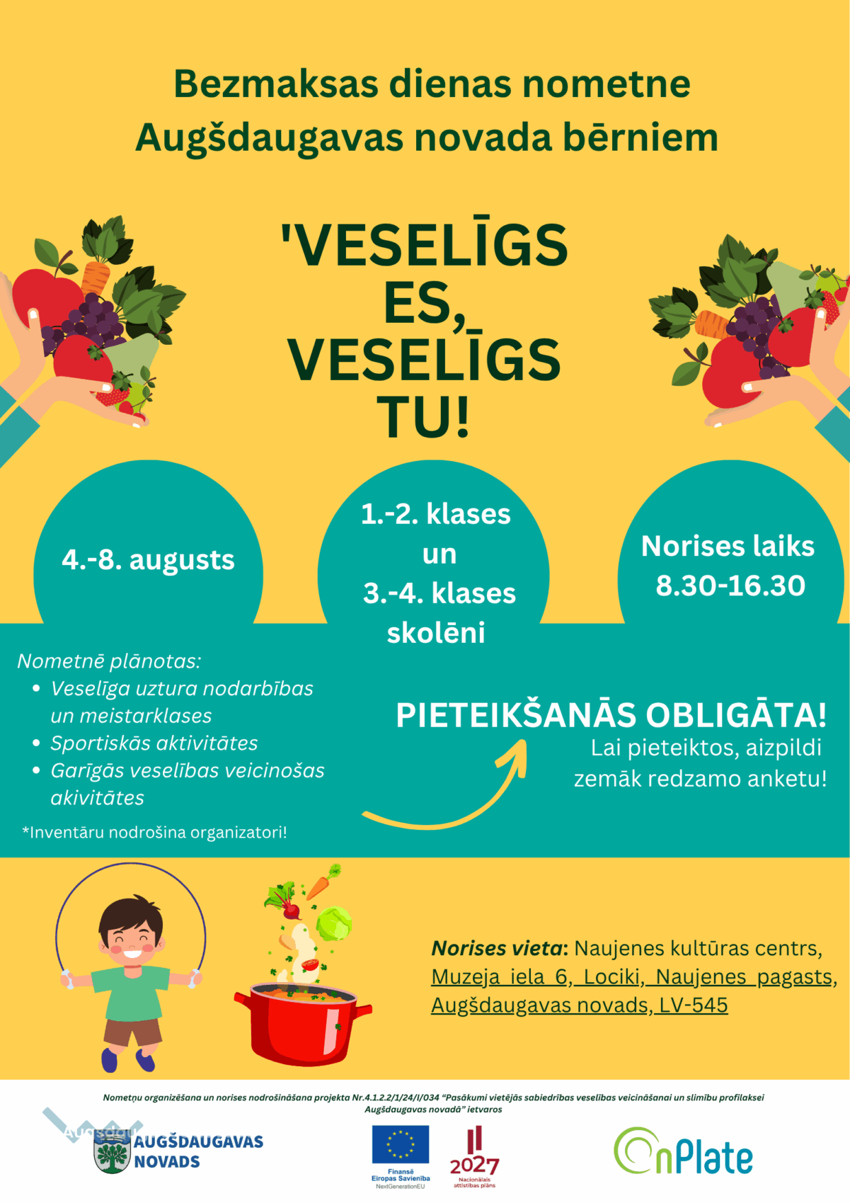 No 4. līdz 8. augustam Naujenes kultūras namā norisināsies bezmaksas veselīga dzīvesveida dienas nometne 1.-4.klases skolēniem.