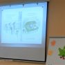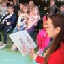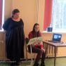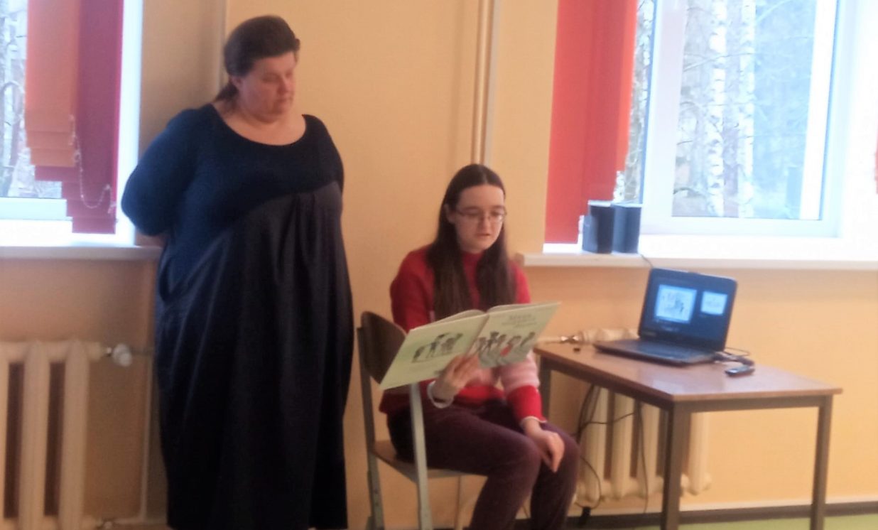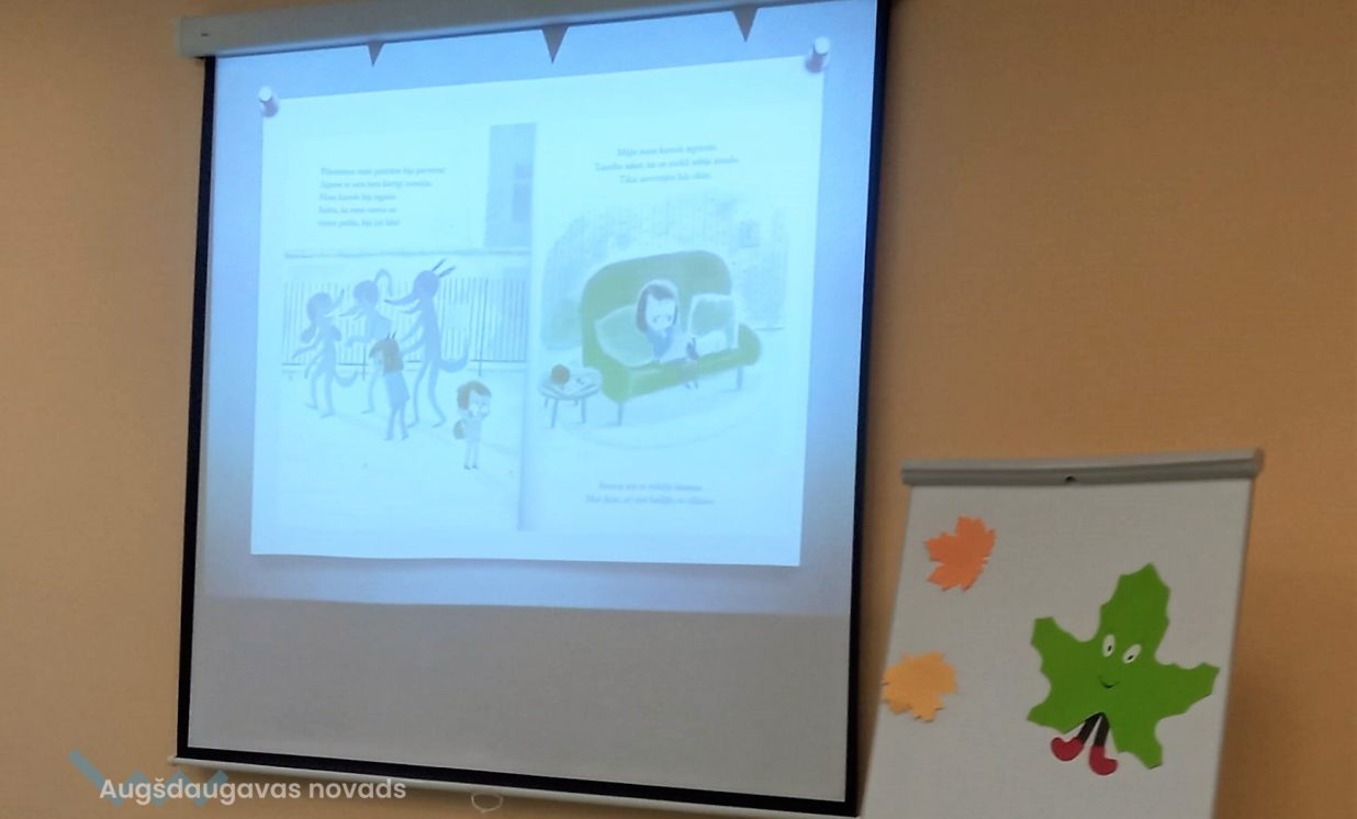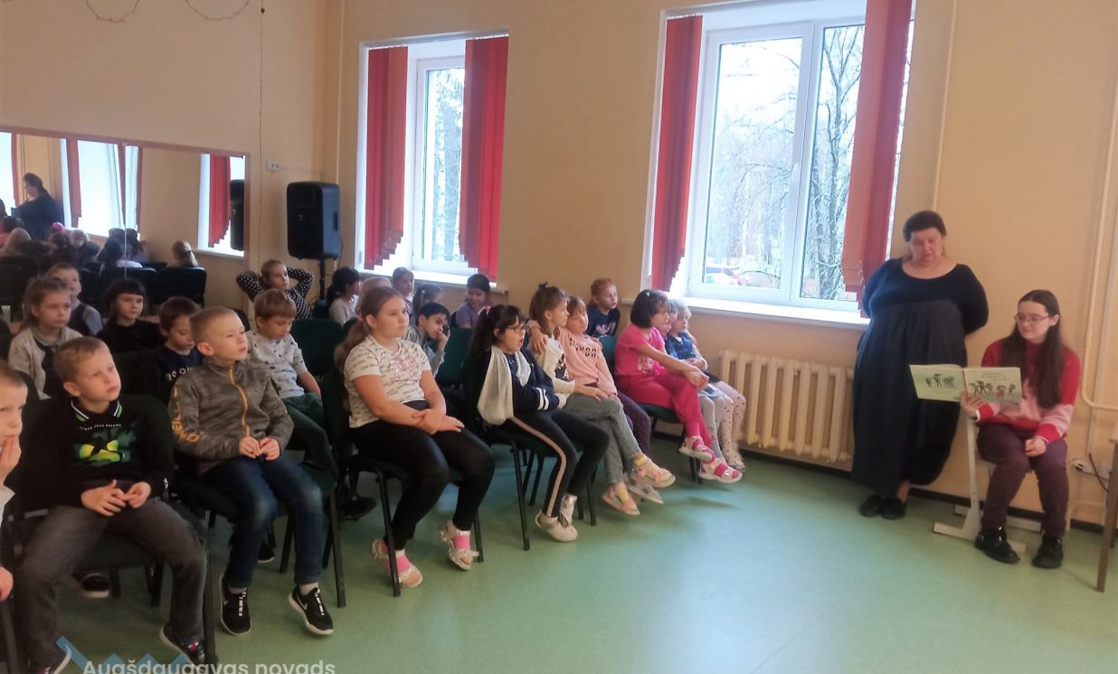 Skolas aktu zālē sapulcējas izglītojamie, kuri ar interesi klausījās A. Kondrašenkovas un A. Kardeles lasījumā un vērīgi lūkojās krāšņajās grāmatas lappusēs, kuras rādīja uz ekrāna.