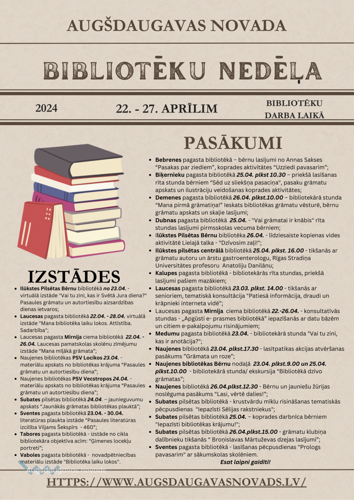 Ik gadu aprīlī tiek atzīmēta Bibliotēku nedēļa. Šogad tā notiks no 22. līdz 27. aprīlim. Bibliotēku nedēļas tēma – Bibliotēkas un lasīšana. Šajā laikā ikkatrā novada publiskajā bibliotēkā notiek dažādas aktivitātes – tikšanās, sarunas, koprades darbnīcas, konkursi, izstādes, pievēršot uzmanību bibliotēku nozarei kopainā un iedvesmojot attīstībai ne tikai vietējo kopienu, bet arī kolēģus citos novados.
