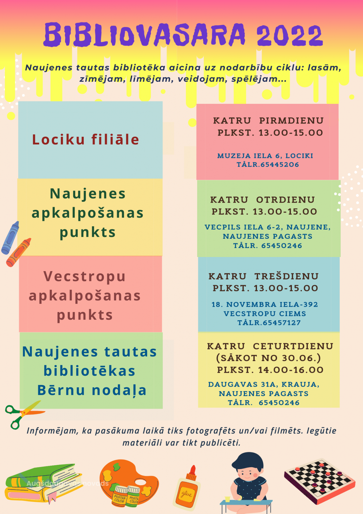 Naujenes tautas bibliotēka aicina bērnus un jauniešus piedalīties radošo nodarbību ciklā “BIBLIOVASARA 2022”!