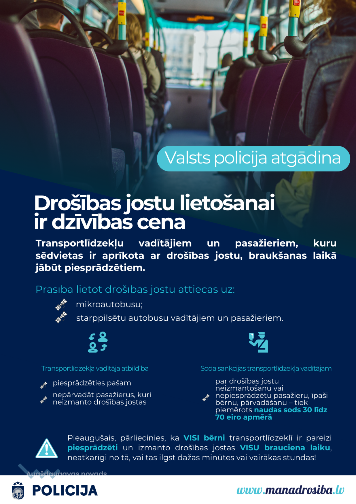 Ņemot vērā 2025. gada janvārī notikušās traģiskās avārijas, kurās smagi cieta un bojā gāja transportlīdzekļu pasažieri, tai skaitā bērni, Valsts policija atgādina: visiem transportlīdzekļu vadītājiem un pasažieriem, kuru sēdvietas ir aprīkota ar drošības jostu, braukšanas laikā jābūt piesprādzētiem!