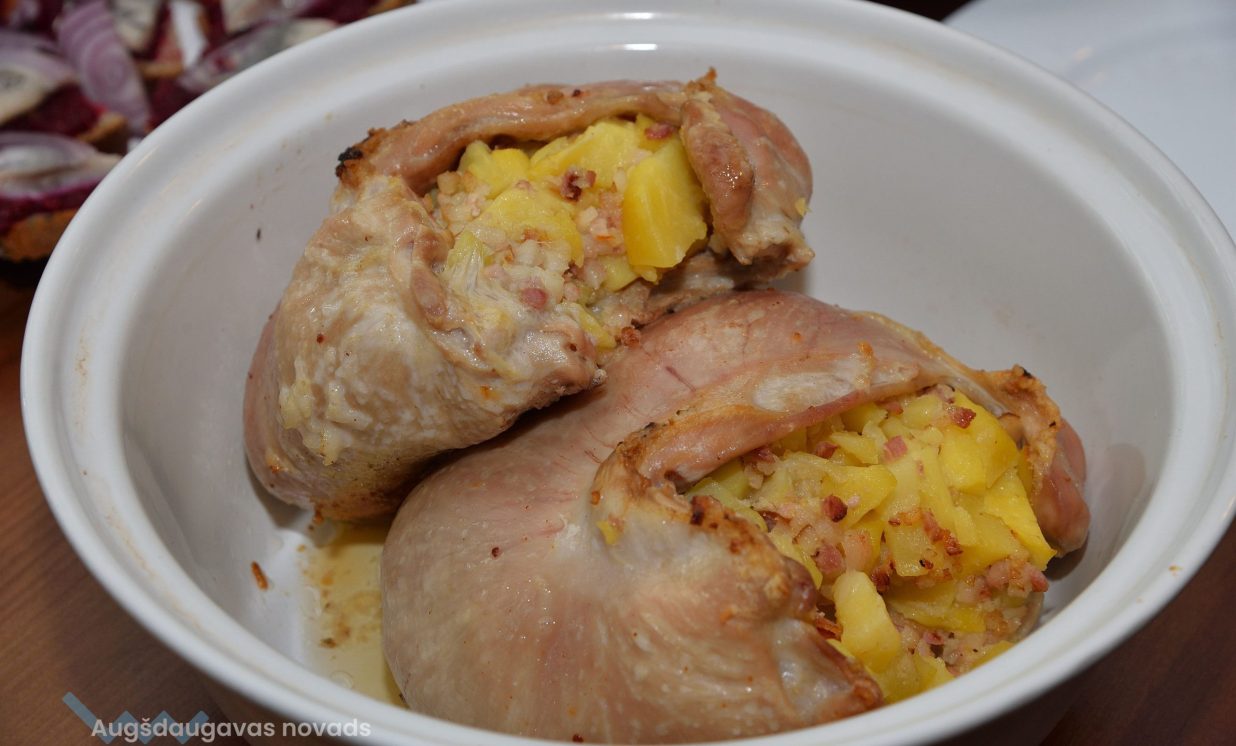 Šīs meistarklase temats bija “Puscūcis un kartupelis saimes galdā rotājās”, tāpēc galdā goda vietā bija gaļas un kartupeļu ēdieni. Uz plīts ilgāku laiku sutinājās īpašais cūku bēru ēdiens – abādu kāposti, kas tika sutināti kopā ar cūkas gaļu, ausīm, asti un citiem atgriezumiem. “Visas šīs cūkas sastāvdaļas, kas nebija glabājamas, uz ātru roku tika izvārītas lielā katlā kopā ar skābiem vai saldiem kāpostiem,” stāsta saimniece.