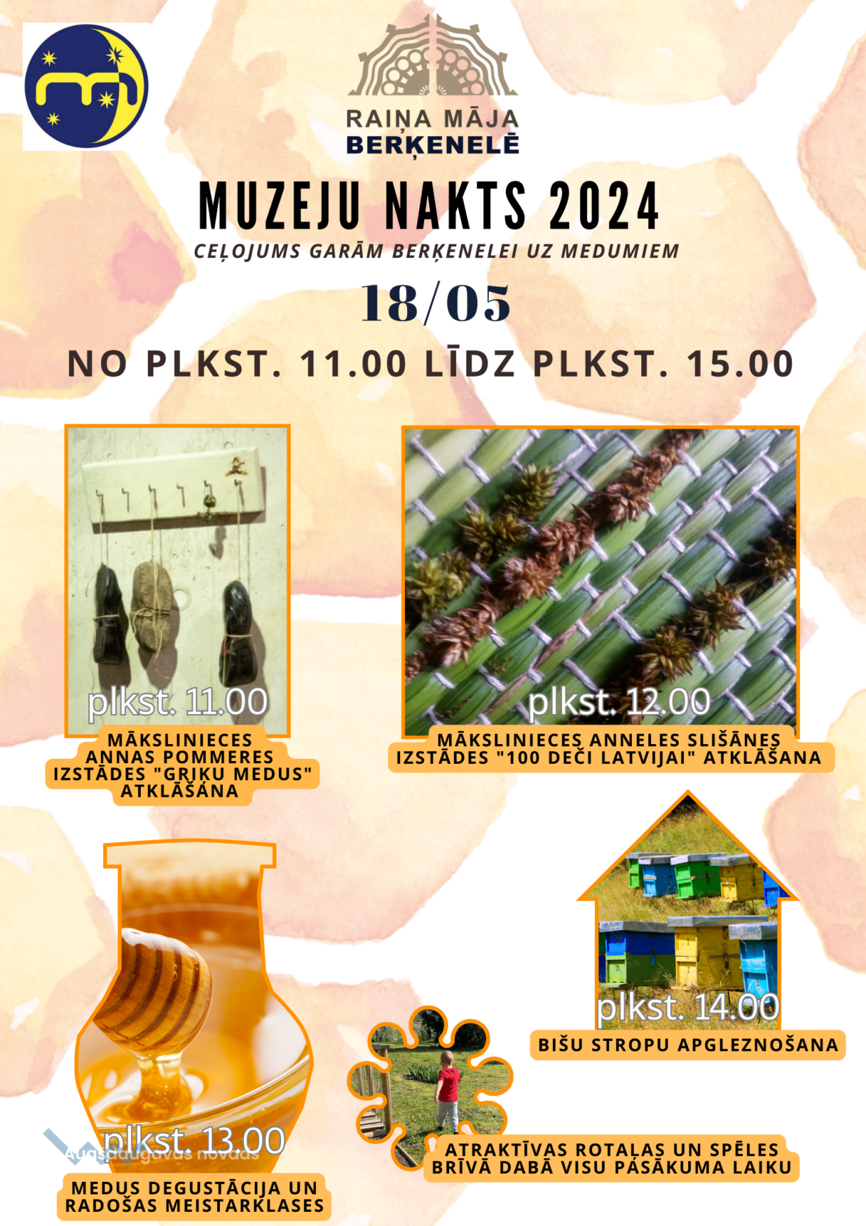 Plkst. 14.00 Mākslinieciska koprades aktivitāte - "Bišu stropu apgleznošana" (Raiņa mājā Berķenelē šogad atgriezušies dažādi seni bišu stropi. Lai atjaunotu Raiņa mājas Berķenelē ainavu, kāda tā redzama Vitālija Kalvāna gleznā "Berķenele" (20. gs. 60. gadi), tie tika restaurēti un mēs aicinām "Muzeju nakts" apmeklētājus kopīgi iesaistīties to apgleznošanā.)