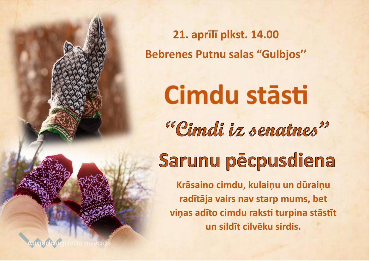 21. aprīlī plkst. 14.00 Bebrenes pagasta Putnu salas "Gulbjos" uz sarunu pēcpusdienu tiek aicināti dalīties savos cimdu stāstos visi, kam tuvu pie sirds Sēlijas cimdu raksti.