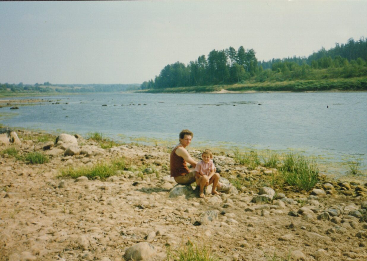 Dainis Īvāns ar dēlu Jurģi Slutiškos pie Daugavas. Naujenes pagasts, 1992