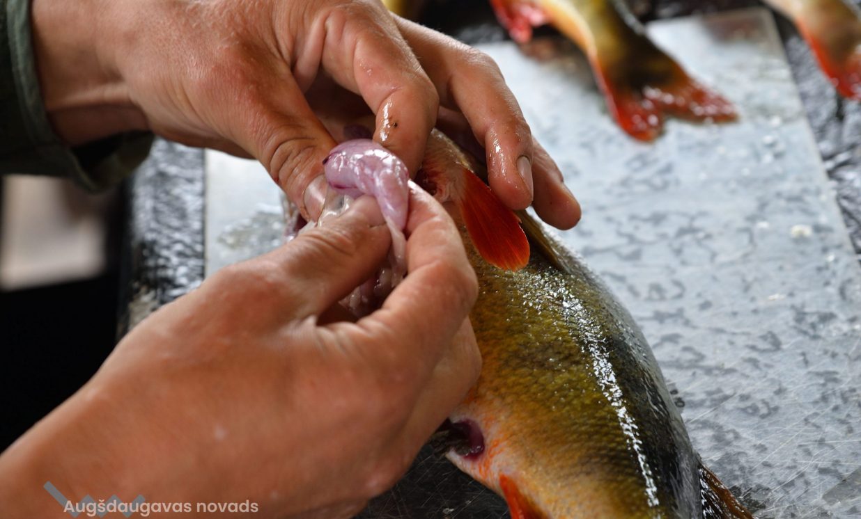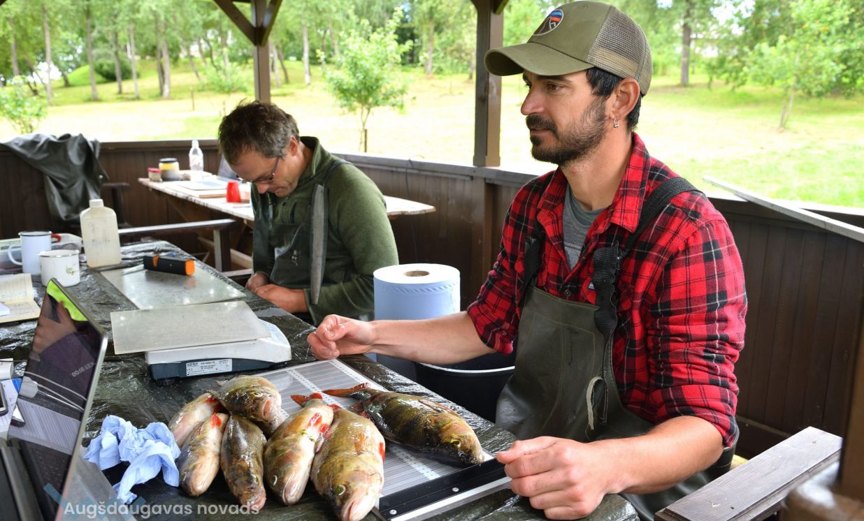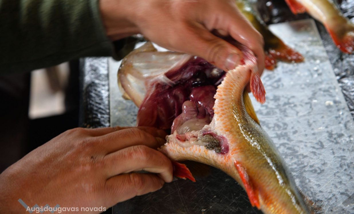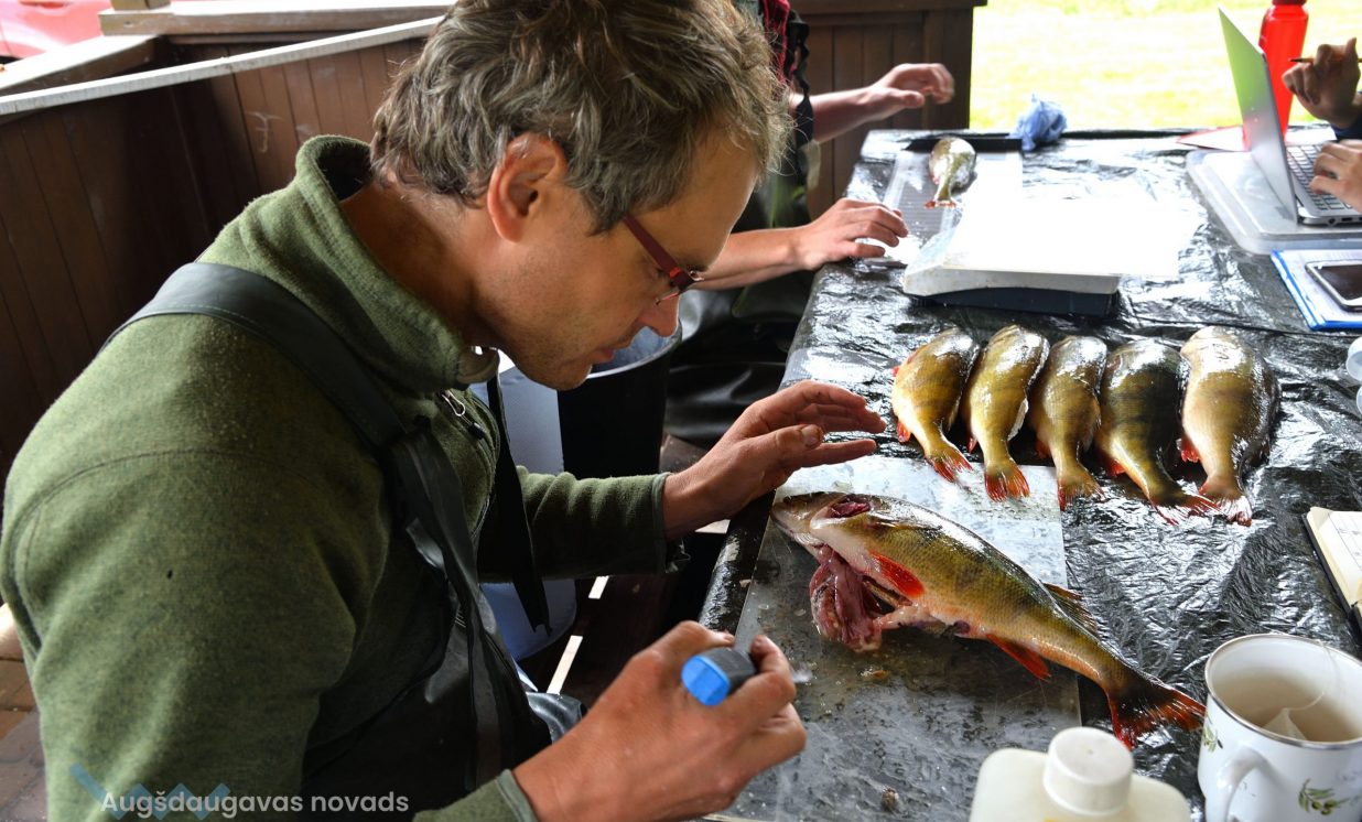 Matīss Žagars preparē zivi, iegūstot pētniecībai nepieciešamos datus