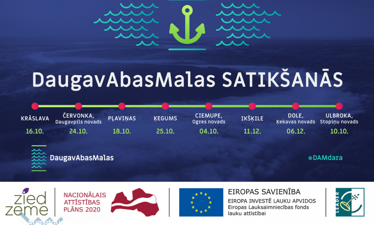 Pavisam projekta laikā oktobrī un decembrī notiks astoņas “DaugavAbasMalas” satikšanās, un katrai no konferencēm ir sava tēma, kas dos iespēju iedziļināties plašā jautājumu klāstā un risināt specifiskām mērķa grupām aktuālas problēmas. Diskusijās aicināti pulcēties vietējie vides aktīvisti, pašvaldību amatpersonas, tūrisma uzņēmēji, NVO pārstāvji, amatnieki, pētnieki, politikas plānotāji, jaunieši un citas aktīvās iedzīvotāju grupas, lai veidotu sadarbības un kopīgiem spēkiem sekmētu tūrisma un uzņēmējdarbības attīstību Daugavas baseinā.