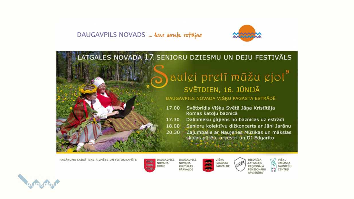 Svētdien, 16. jūnijā, Daugavpils novada Višķu pagasta estrādē notiks Latgales novada 17. Senioru dziesmu un deju festivāls “Saulei pretī mūžu ejot”. Festivālā piedalīsies Latgales reģionālās pensionāru apvienības, novada pensionāru biedrību, Latgales pašvaldību kultūras iestāžu un citu organizāciju senioru amatiermākslas kolektīvi: 4 kori, 24 vokālie ansambļi, 10 folkloras kopas un etnogrāfiskie ansambļi, 10 mazākumtautību kolektīvi, 23 Eiropas deju kopas, 5 senioru deju kopas, 9 tautas deju kolektīvi, viens līnijdeju kolektīvs un viena amatnieku apvienība, kopā pulcējot ap 1100 dalībnieku.