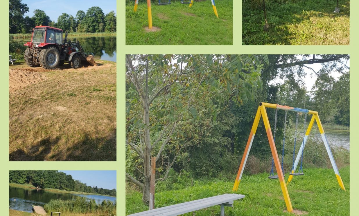 * Demenes ezera pludmales krasta teritorija, kur izgatavoja un uzstādīja jaunus soliņus, pārkrāsoja šūpoles, atremontēja esošas atkritumu tvertnes, atbrīvoja krastu no sausiem krūmiem un nezālēm.