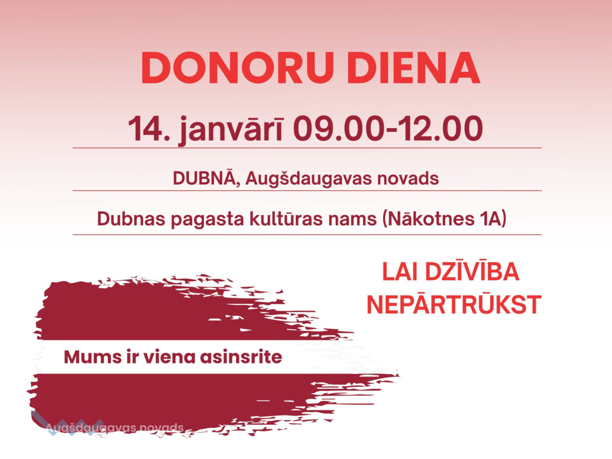 Valsts asinsdonoru centrs (VADC) rīko Asins donoru dienu Augšdaugavas novada Dubnā (Dubnas kultūras nams Nākotnes iela 1A).
