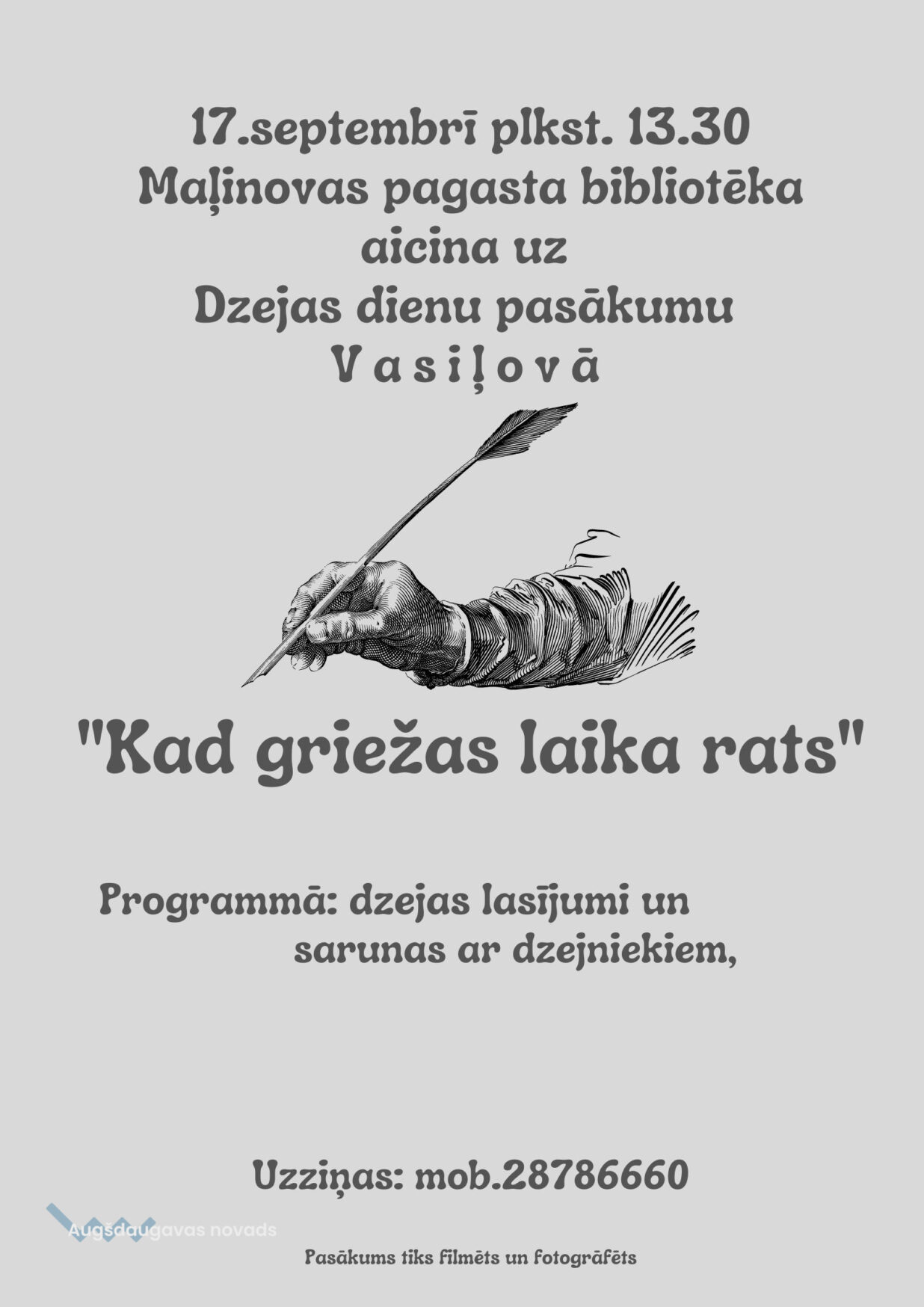 Dzejas diena Maļinovā11.09.2024AKTUĀLI Aicinām visus uz dzejas dienu pasākumu Maļinovas pagasta Vasiļovā uz tikšanos ar dzejniekiem, Elizabeti no Krāslavas novada, Egitu-Terēzi Jonāni, Liliju Voronovu no Daugavpils, Diānu Bramani no Vīgantiem.Aicinām baudīt dzeju un sarunas ar dzejniekiem.