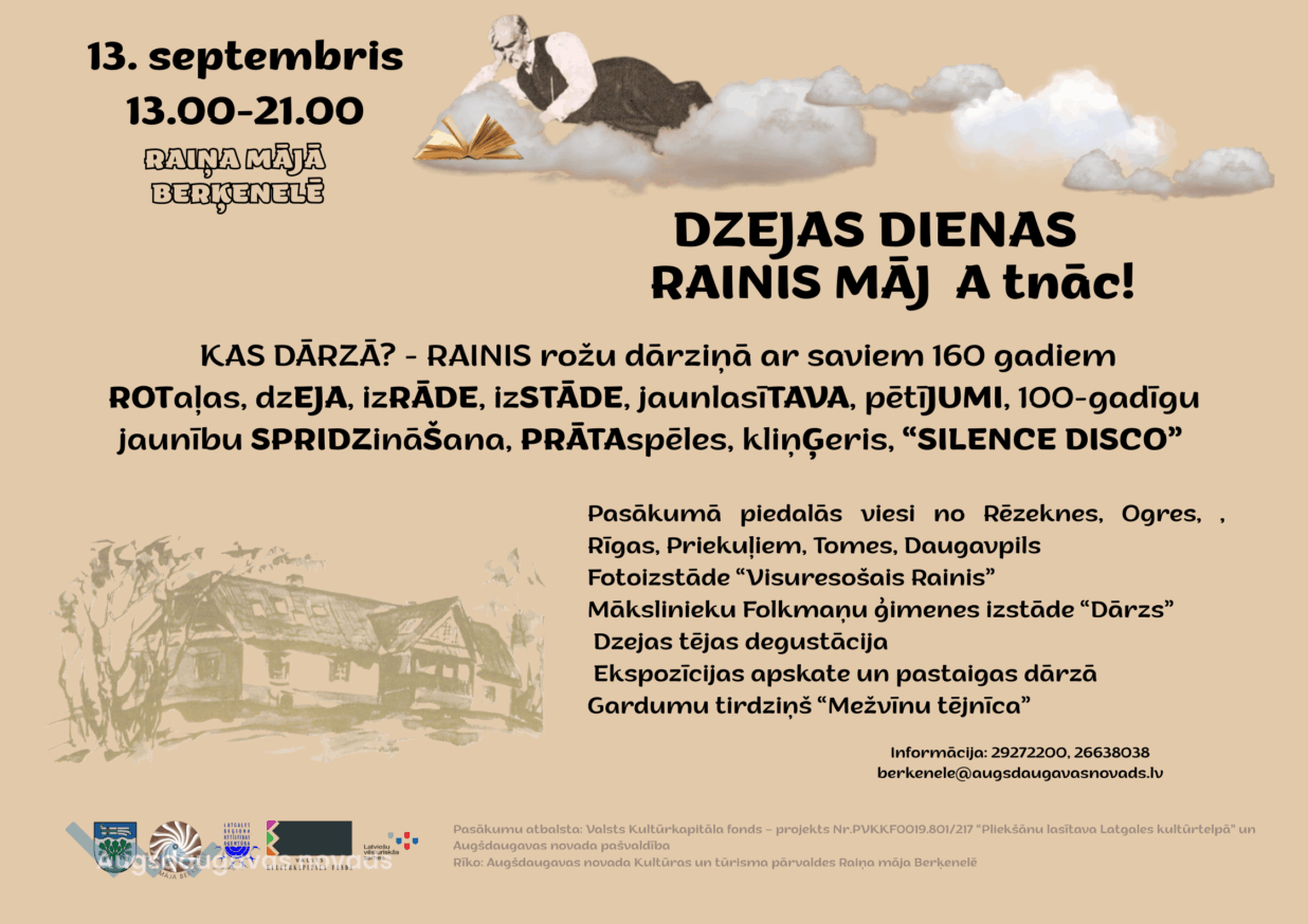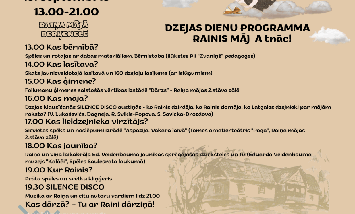 Raiņa mājā Berķenelē 13. septembrī ar vērienīgu Dzejas dienu pasākumu RAINIS MĀJ Atnāc! atzīmēs Raiņa 160 gadu jubileju.