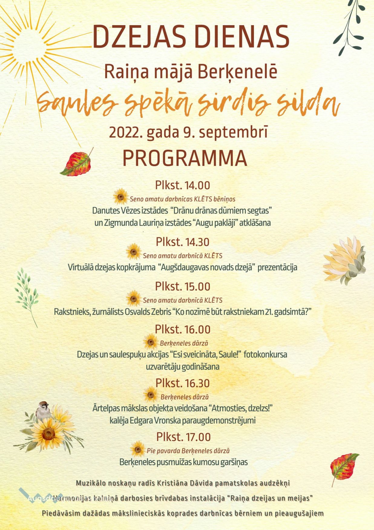 Par muzikālo noskaņu rūpēsies Kristiāna Dāvida pamatskolas audzēkņi, Harmonijas kalniņā darbosies brīvdabas instalācija “Raiņa dzeijas un meijas”, tiks piedāvātas arī radošās darbnīcas visiem vecumiem un gaumēm! Dzejas dienu noslēgumā varēs nogaršot Berķeneles pusmuižas krāsns pavarda sarūpētos gardumus.