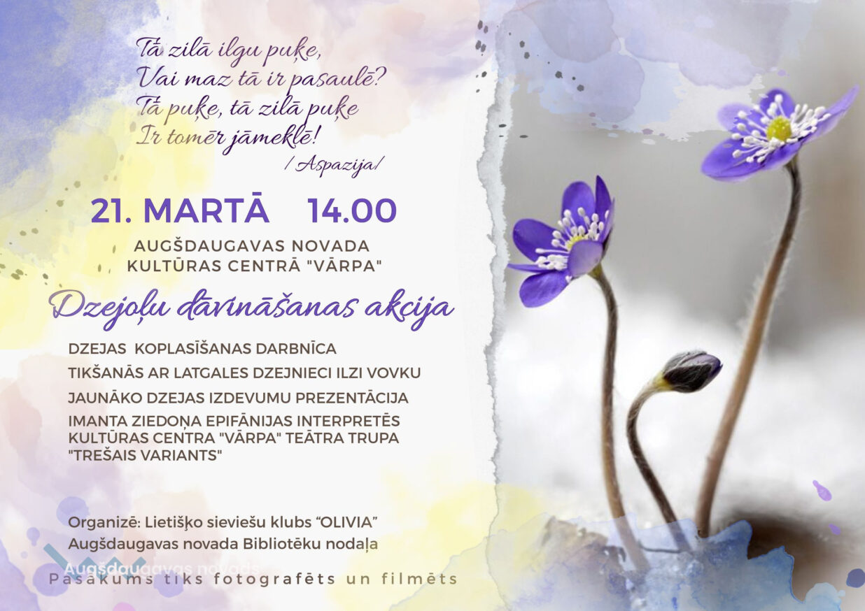 Šajā dienā Lietišķo sieviešu klubs “OLIVIA” sadarbībā ar Augšdaugavas novada Bibliotēku nodaļu Augšdaugavas novada Kultūras centrā “Vārpa” rīko pasākumu, kur varēsim klausīties dzeju aktieru un dzejnieku izpildījumā, iepazīt jaunākos mūsdienu dzejas izdevumus. Notiks koplasīšanas darbnīca, kur ikviens aicināts nolasīt sev tuvas dzejas rindas un dalīties gūtajās emocijās.