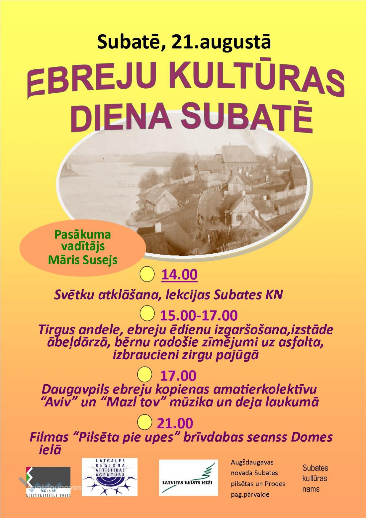 Subates mazpilsēta, tās vēsture ir veidojusies daudzus gadus kopā mijoties dažādu tautu kultūrām, konfesiju tradīcijām. Ebreji un viņu ticība pilsētā līdz otrajam pasaules karam bija aktīvi un ieņēma nozīmīgu vietu. Ebreju kultūras dienas Subatē 21.augustā sniegs visiem ineresentiem un jo īpaši subatiešiem iespēju uzzināt šīs tautas kultūru, vēsturi.