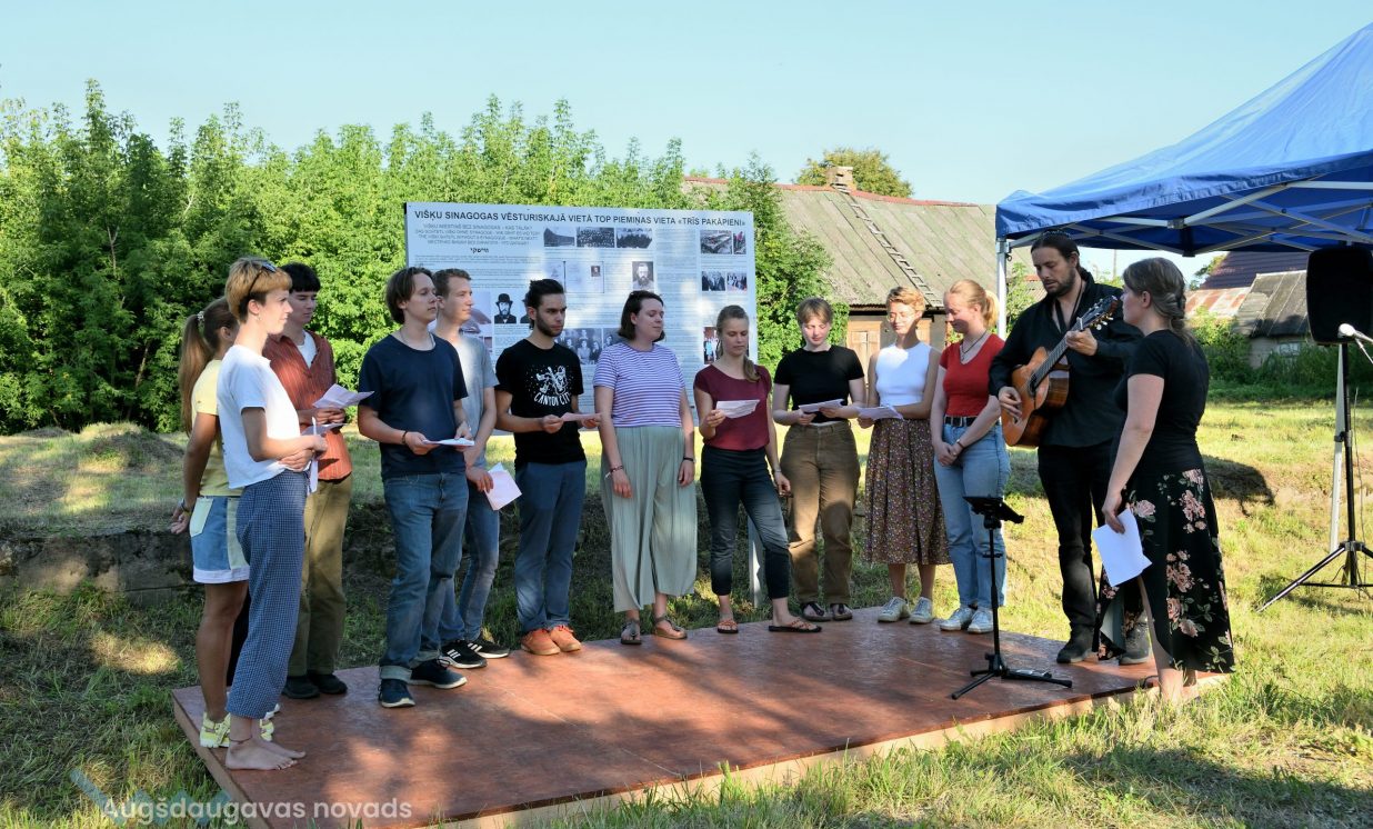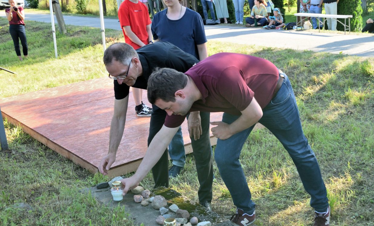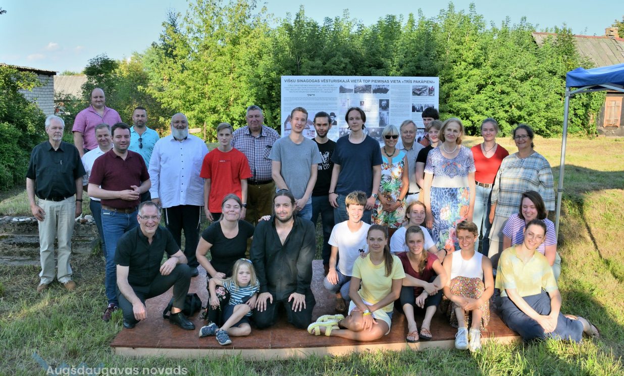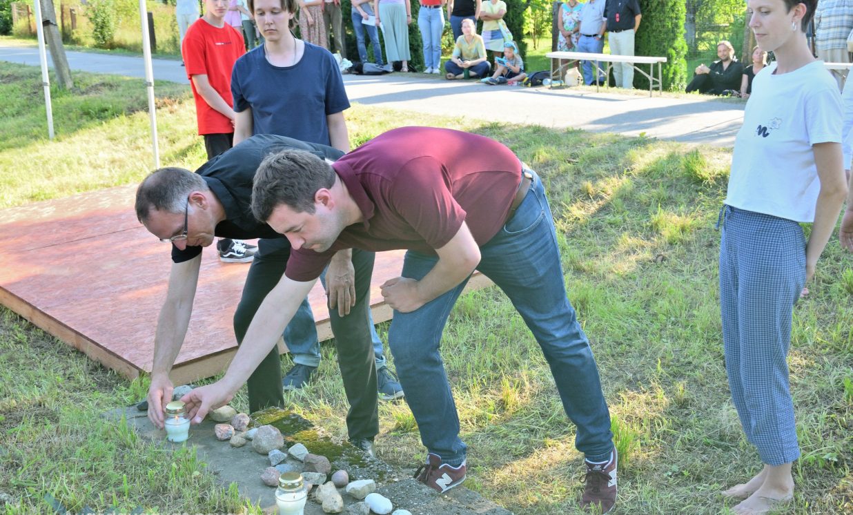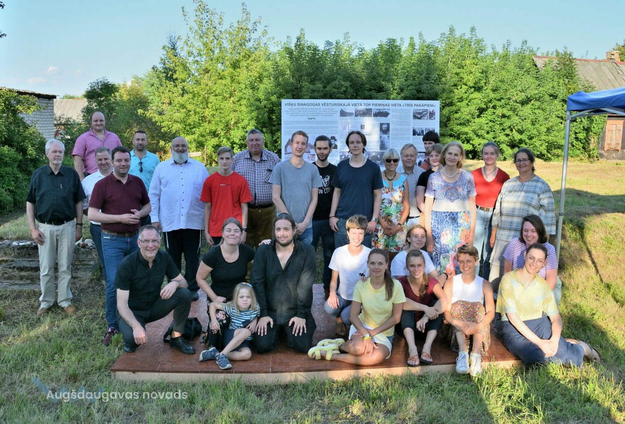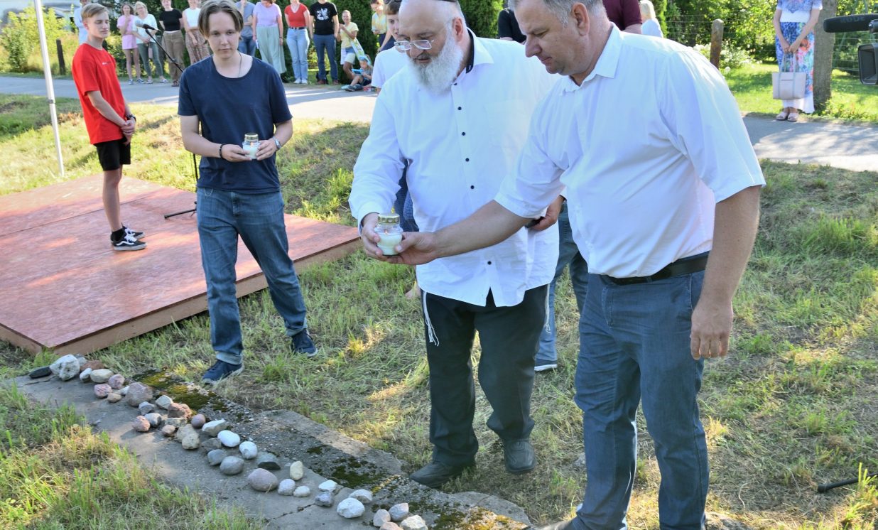 Višķu pagasta pārvaldes vadītājs Jānis Proms kopā ar Baruhu Čauskinu, Vācijas pārstāvjiem un jauniešiem nolika piemiņas sveci pie bijušās sinagogas pamatiem.