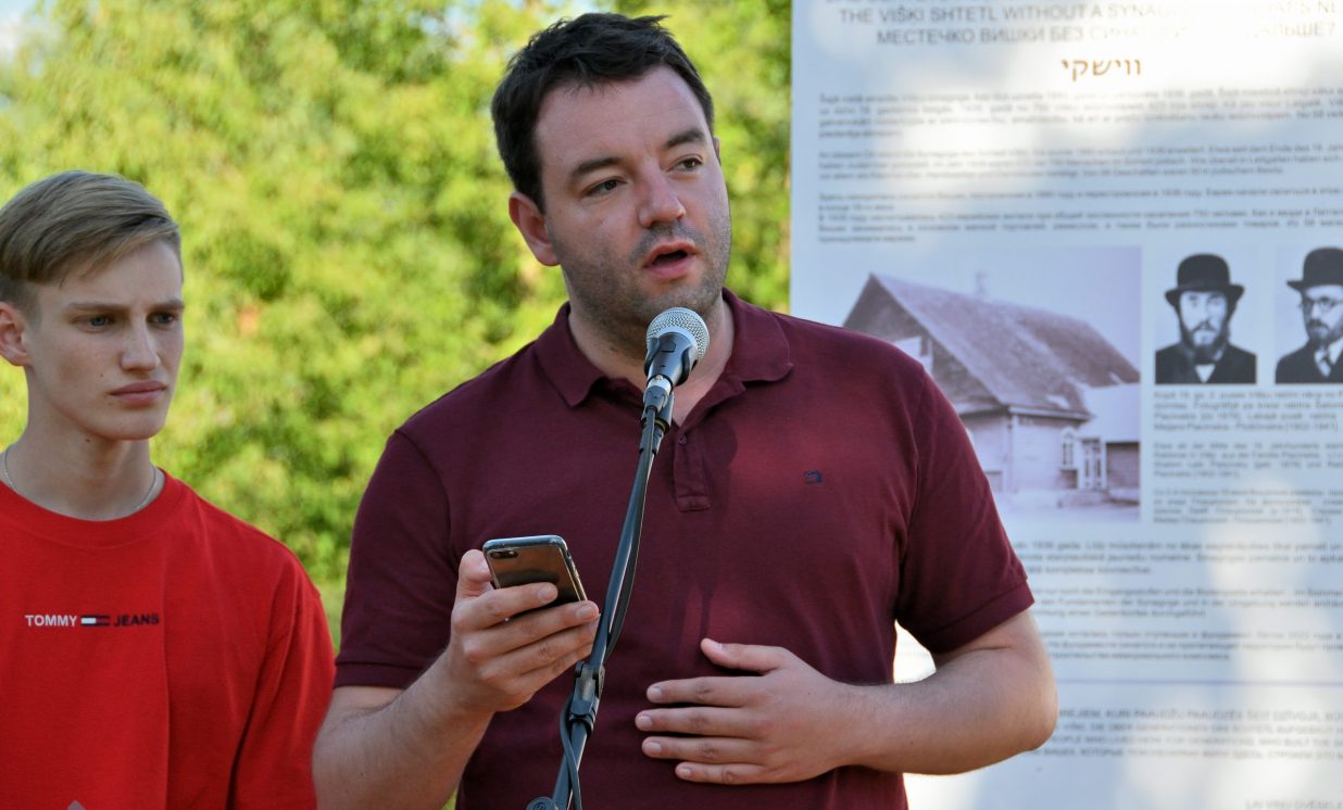 “Man ir gods kārtējo reizi sveikt jūs pie bijušās sinagogas piemiņas vietas. Šis gads ir īpašs ar to, ka mēs svinam piecus gadus, kopš sadarbības sākuma ar biedrību ”Drei Stuffen” (“Trīs pakāpieni”). Īpaši pateicos Baruham Čauskinam – viņs ir izdarījis ļoti daudz Višķu labā,” teic Višķu pagasta pārvaldes vadītājs Jānis Proms, piebilstot, ka šis darbs nav gluži taustāms vai redzams, bet tas ir darbs vēstures lappuses iepazīšanai, kura tika izsvītrota no pagasta vēstures. Nākotnē uz bijušās sinagogas pamatiem viņš ļoti cer izveidot piemiņas memoriālu – satikšanās vietu, kur varētu iepazīties ar Višķu un Latgales ebreju vēsturi.