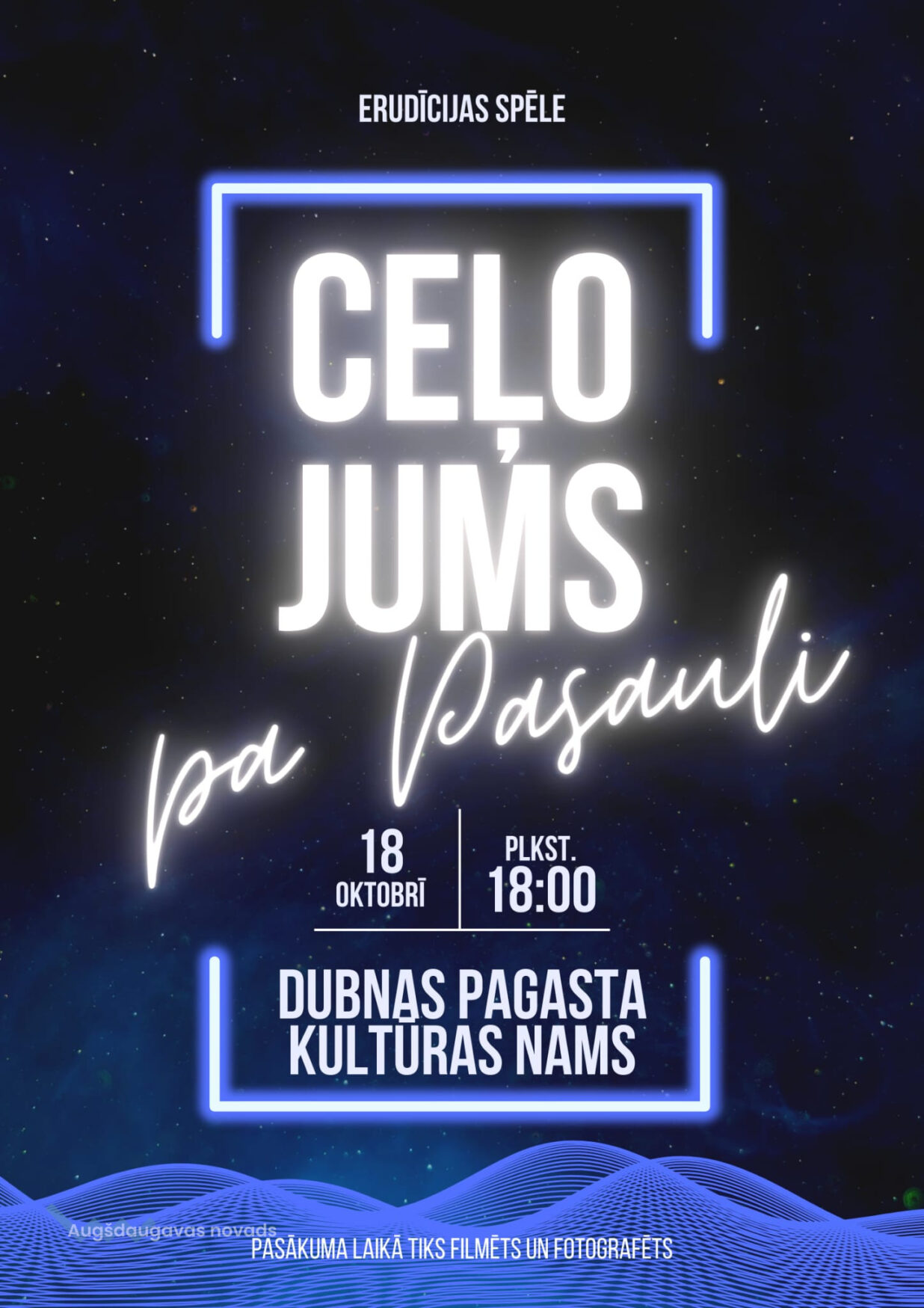 18.oktobrī no plkst. 18-00 līdz 23-00 Dubnas pagasta kultūras namā norisināsies Augšdaugavas novada jaunatnes erudīcijas spēle "Ceļojums pa pasauli", ko organizē Višķu jauniešu attīstības centra jaunieši.