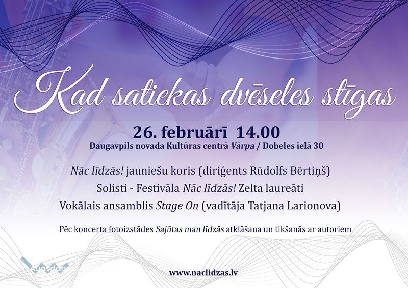 26. februārī plkst. 14.00 Daugavpils novada Kultūras centrā “Vārpa” (Dobeles ielā 30, Daugavpilī) notiks koncerts “Kad satiekas dvēseles stīgas”, kurā piedalīsies fonda „Nāc līdzās!” jauniešu koris un solisti – zelta laureāti, kā arī Daugavpils novada Kultūras centra vokālais ansamblis „Stage On”.