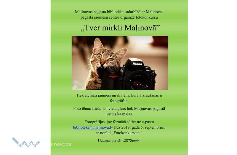 Maļinovas pagasta bibliotēka sadarbībā ar Maļinovas pagasta jauniešu centru organizē fotokonkursu „Tver mirkli Maļinovā”. Ņemt dalību konkursā tiek aicināti visi pagasta jaunieši un ikviens, kura aizraušanās ir fotogrāfija. Fotogrāfijas ar Maļinovas pagasta kultūrvēsturiskajiem objektiem, dabu, ciemu ainavām, savu ģimeni, draugiem... Paskatieties apkārt un tveriet mirkli šodien pat!