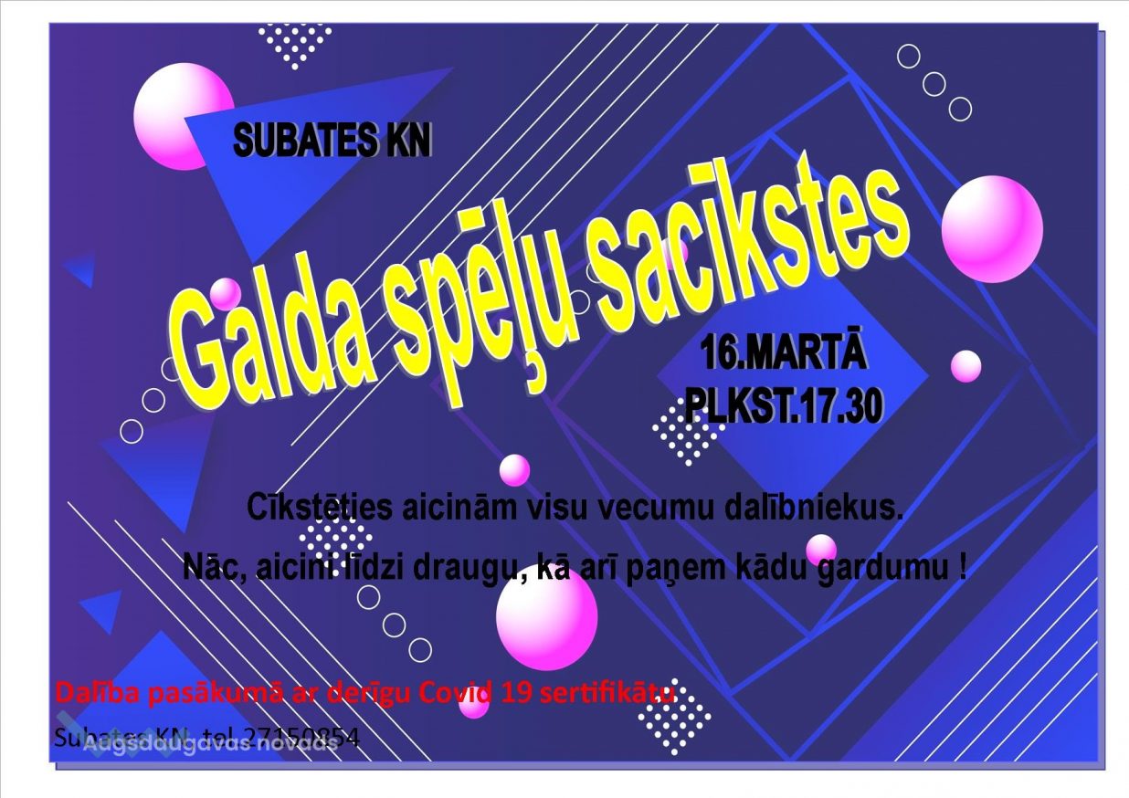 16. martā plkst. 16.30 Subates kultūras namā norisināsies "Galda spēļu sacīkstes".