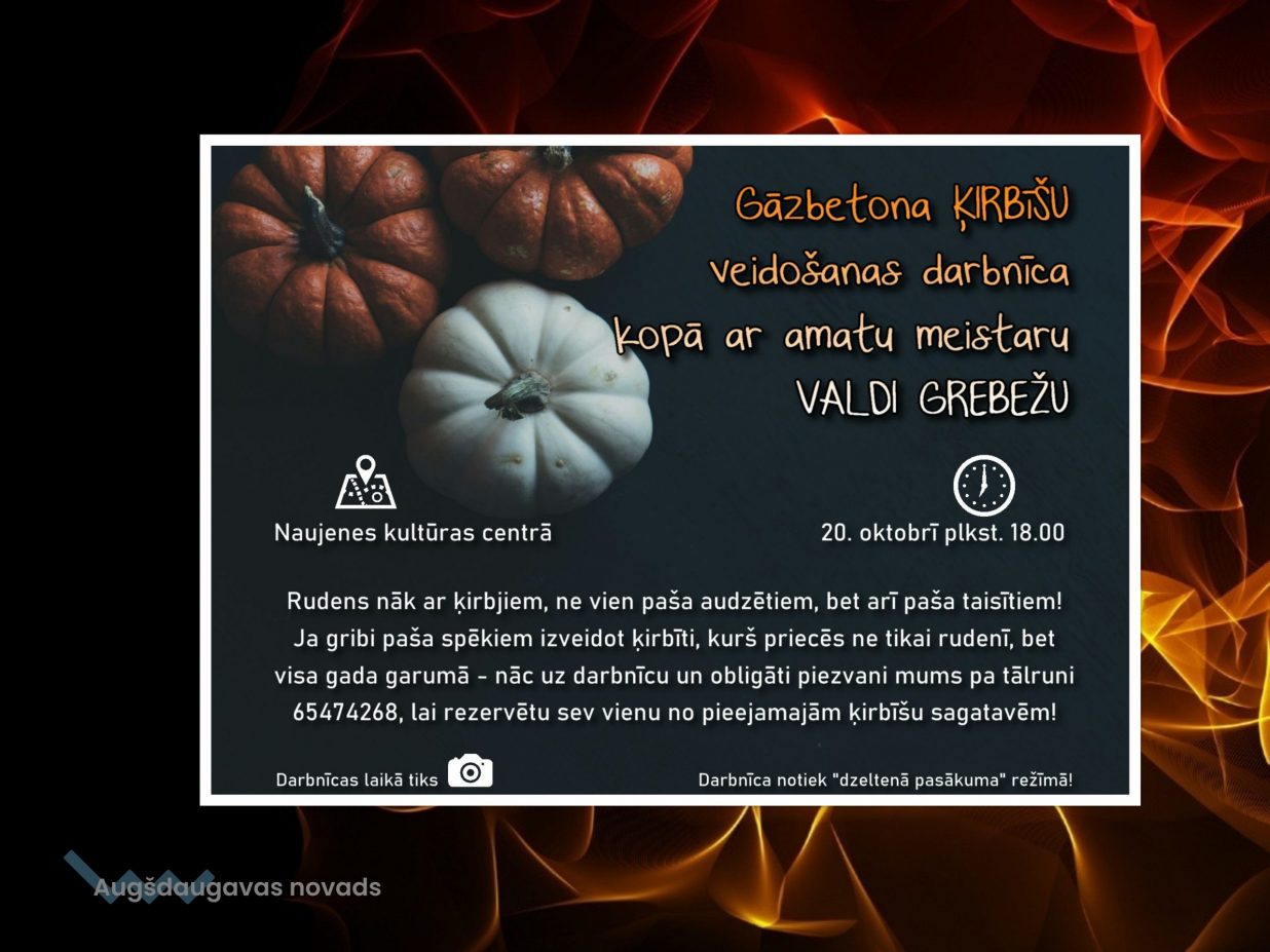 20. oktobrī plkst. 18.00 Naujenes kultūras centrā amatu meistara Valda Grebeža vadībā veidosim rudens vēstnešus – ķirbīšus! Ja vēlies savās mājās ķirbīti, kas priecēs ne tikai rudens periodā, bet visa gada garumā, piezvani mums pa tālruni 65474268, vai uzraksti uz e-pastu: naujene_kc@inbox.lv, lai rezervētu sev vai savam draugam vienu no pieejamajām ķirbīšu sagatavēm. Pieteikšanās līdz 15. oktobrim, vietu skaits ierobežots!