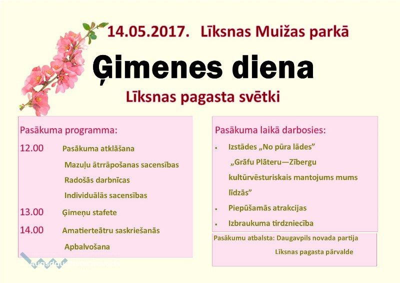 14. maijā Līksnas Muižas parkā svinēsim Ģimenes dienu. Jau no plkst. 12.00 ģimenes varēs piedalīties radošajās darbnīcās, veidojot ziedus māmiņām, vārot žagariņus un pārbaudīt savu spēku, izveicību rāpjoties umurkumurā. Kā arī pirmo reizi notiks mazuļu ātrrāpošanas sacensības.