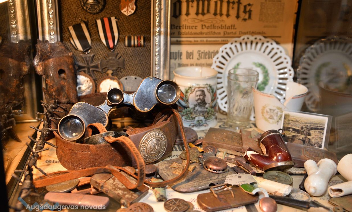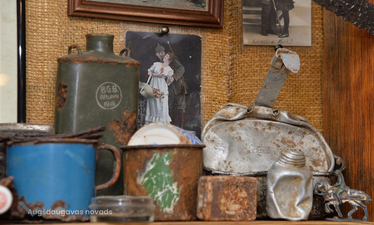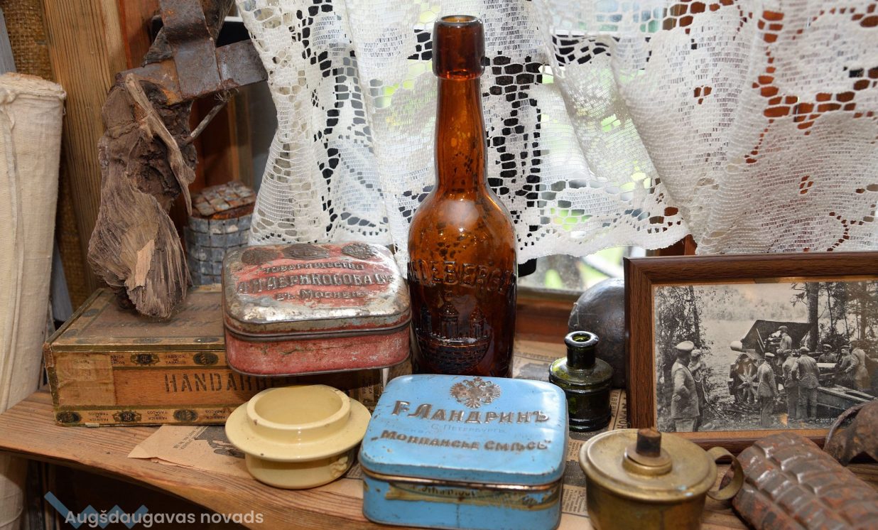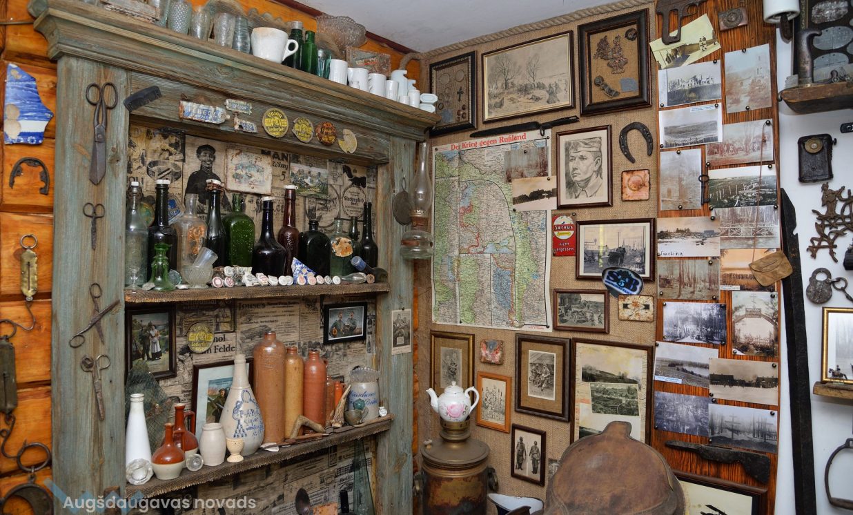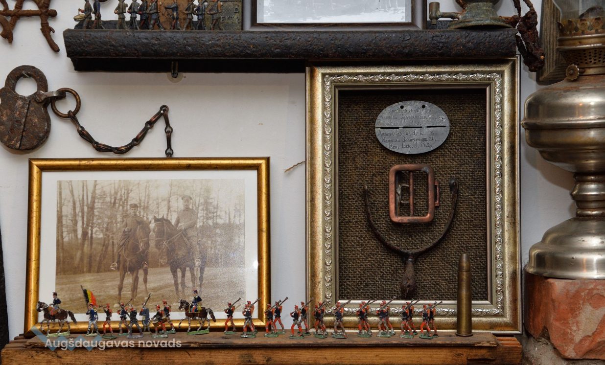 Esošā ekspozīcija nosacīti sadalīta divās daļās – vienu veido Raimonds, otru Juris. Gan vienā, gan otrā ir, ko redzēt. Eksponātus Juris nepērk un arī nepārdod. Viss ir paša un brāļa atrasts. Ekspozīcijā ir dažādi munīcijas pārpalikumi, zaldātu ikdienā lietotie priekšmeti. Juris aizrautīgi stāsta par saviem atradumiem, ar katru no tiem saistās kāds īpašs stāsts. Stikla vitrīnā redzami vairāki plēsīga putna atveidojumi metālā, tas ir Prūsijas karalistes ģerbonis, kas rotājis daudzu vācu zaldātu ķiveres. Retāki ir citu Vācijas federālo zemju, piemēram, Saksijas ģerboņi, taču Jurim izdevies atrast arī tādu. Visi eksponāti jau vairāk kā simts gadus atradušies zem sūnām vai zemes, daudzus skāris laika zobs, taču liela daļa par brīnumu labi saglabājusies, tostarp kara hospitāļa plākstera iepakojums ar visiem uzrakstiem un plāksteri. Plauktos liela stikla pudelīšu kolekcija. Daudzās kara laikā atradušies medikamenti. Juris uzgājis odekolona pudeli ar visu papīra etiķeti, uz kuras joprojām var salasīt “Kölnisch Wasser” (“Ķelnes ūdens”), tādu Vācijā ražojot līdz mūsu dienām. Greznās stikla glāzītes izrādās sinepju un džema trauciņi, ko vēlāk zaldāti izmantojuši grādīgā saliešanai.