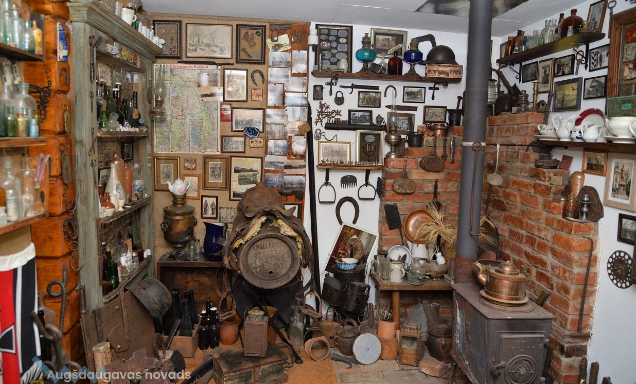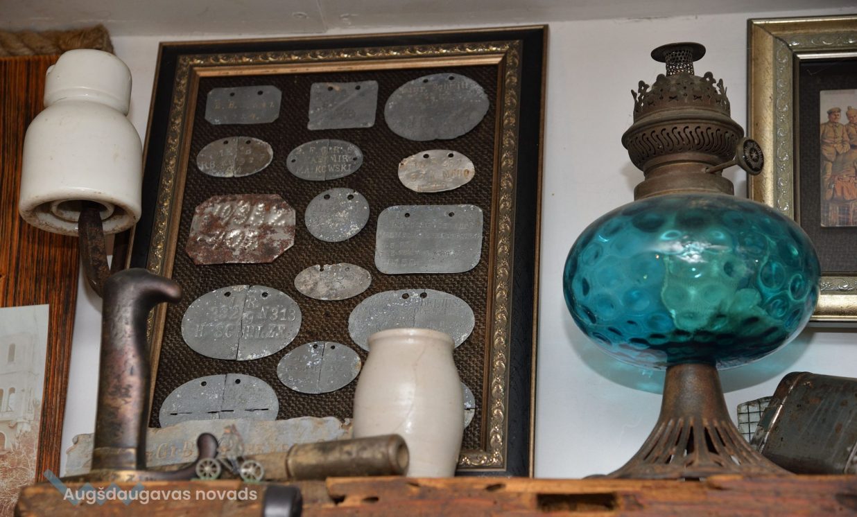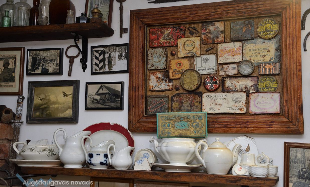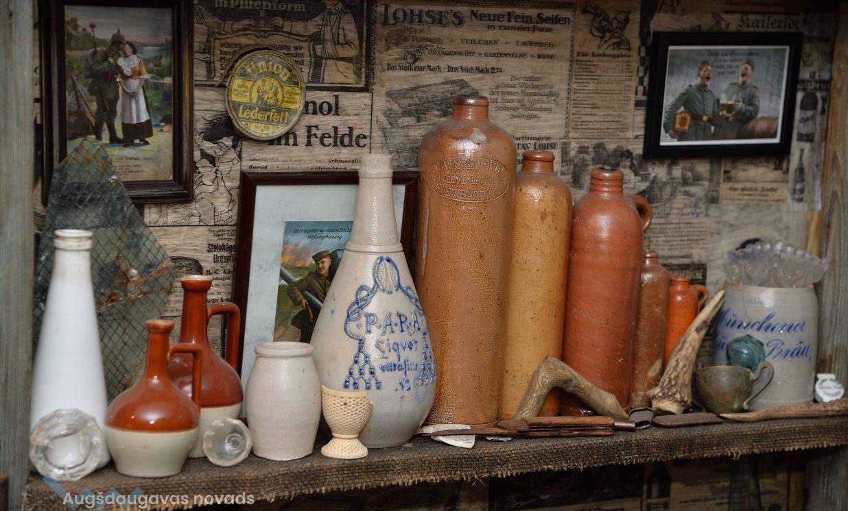 Esošā ekspozīcija nosacīti sadalīta divās daļās – vienu veido Raimonds, otru Juris. Gan vienā, gan otrā ir, ko redzēt. Eksponātus Juris nepērk un arī nepārdod. Viss ir paša un brāļa atrasts. Ekspozīcijā ir dažādi munīcijas pārpalikumi, zaldātu ikdienā lietotie priekšmeti. Juris aizrautīgi stāsta par saviem atradumiem, ar katru no tiem saistās kāds īpašs stāsts. Stikla vitrīnā redzami vairāki plēsīga putna atveidojumi metālā, tas ir Prūsijas karalistes ģerbonis, kas rotājis daudzu vācu zaldātu ķiveres. Retāki ir citu Vācijas federālo zemju, piemēram, Saksijas ģerboņi, taču Jurim izdevies atrast arī tādu. Visi eksponāti jau vairāk kā simts gadus atradušies zem sūnām vai zemes, daudzus skāris laika zobs, taču liela daļa par brīnumu labi saglabājusies, tostarp kara hospitāļa plākstera iepakojums ar visiem uzrakstiem un plāksteri. Plauktos liela stikla pudelīšu kolekcija. Daudzās kara laikā atradušies medikamenti. Juris uzgājis odekolona pudeli ar visu papīra etiķeti, uz kuras joprojām var salasīt “Kölnisch Wasser” (“Ķelnes ūdens”), tādu Vācijā ražojot līdz mūsu dienām. Greznās stikla glāzītes izrādās sinepju un džema trauciņi, ko vēlāk zaldāti izmantojuši grādīgā saliešanai.